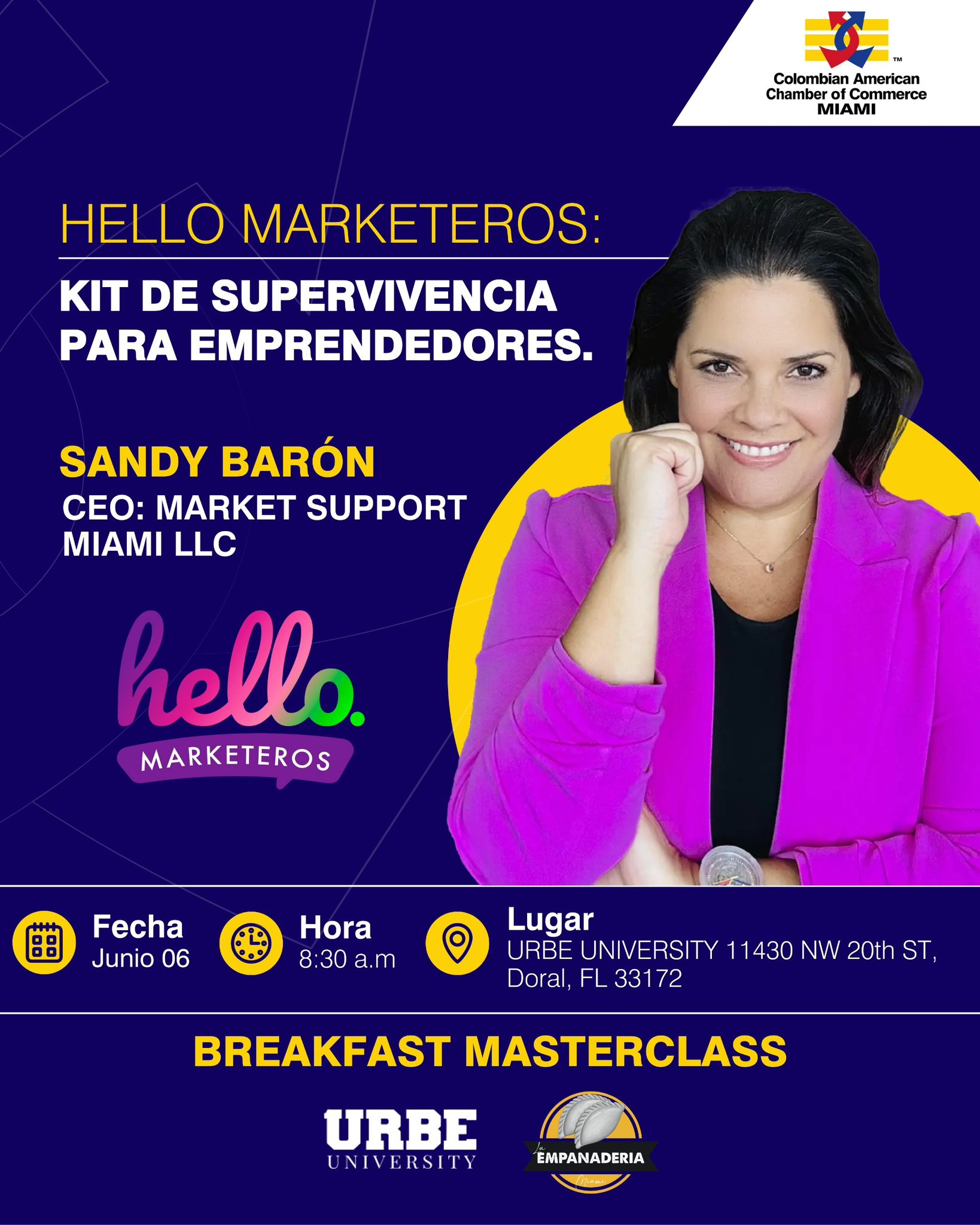| 6/6/2025 | ¿Eres emprendedor y necesitas una guía práctica y rápida para sobrevivir en el competitivo mundo del marketing? La CACC te invita a nuestro próxima Breakfast Masterclass con Sandy Barón, CEO de Market Support Miami LLC y fundadora de Hello Marketeros. Un espacio diseñado especialmente para emprendedores, donde aprenderás a construir bases sólidas y estrategias de tu negocio como lo hacen las grandes marcas y conectar con tu audiencia, tomando decisiones estratégicas de alto impacto. 📅 Junio 6 | 🕣 8:30 a.m. 📍 URBE University – Doral, FL 🎯 Una mañana para aprender, entrenar, conectar y activar el potencial de tu negocio. No te pierdas esta oportunidad de recibir herramientas prácticas y reales para potenciar tu emprendimiento. more info... |