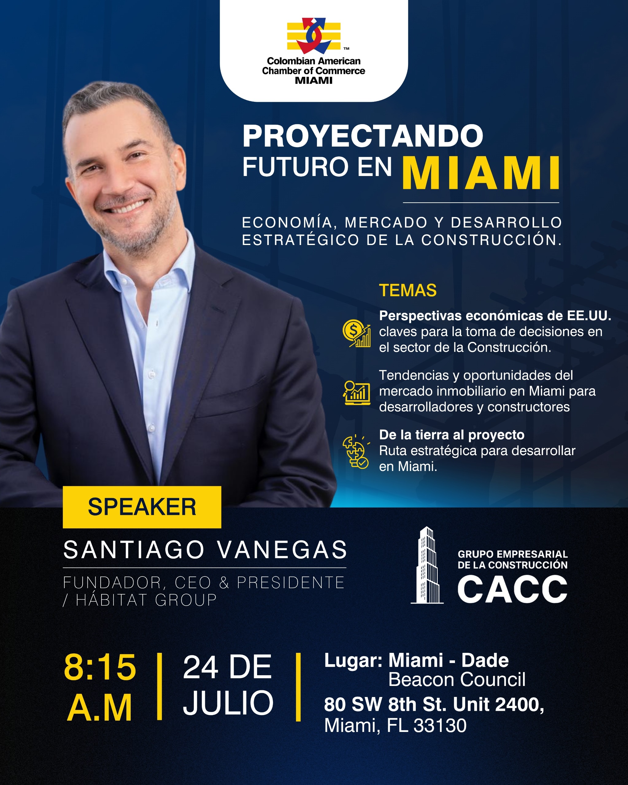 | 7/24/2025 | Miami se proyecta como el epicentro del desarrollo estratégico en construcción. Este 24 de julio acompáñanos en un desayuno empresarial diseñado especialmente para quienes buscan comprender, anticipar y actuar frente a los movimientos del mercado inmobiliario en EE.UU. Santiago Vanegas, CEO de Hábitat Group, compartirá perspectivas clave sobre la economía estadounidense, oportunidades para desarrolladores y la hoja de ruta para transformar tierra en proyectos viables en Miami. Si haces parte del sector constructor o estás explorando nuevas oportunidades en este mercado y aún no perteneces a la Cámara de Comercio Colombo Americana Miami este espacio es para ti. Sólo por invitación. more info... |