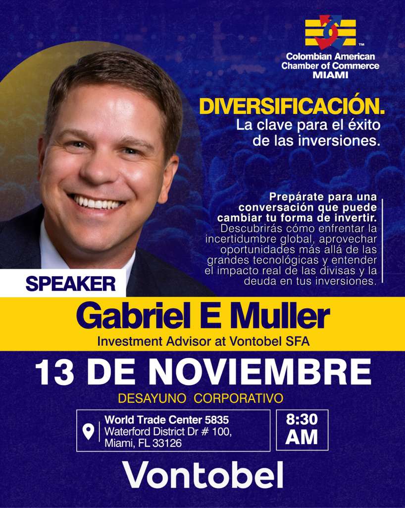 | 11/13/2025 | En la CACC, seguimos creando espacios que fortalecen la toma de decisiones financieras inteligentes para nuestros miembros. Este 13 de noviembre, acompáñanos en nuestro Desayuno Corporativo con Gabriel E. Muller, Investment Advisor en Vontobel SFA, quien compartirá estrategias prácticas sobre cómo la diversificación puede ser la clave para el éxito y la estabilidad de tus inversiones. Aprende cómo distribuir tus recursos de forma estratégica, reducir riesgos y potenciar tu portafolio en mercados cambiantes. Conecta con empresarios, líderes e inversionistas que comparten tu visión de crecimiento. 📍 Lugar: World Trade Center – Miami, FL 🕣 Hora: 8:30 A.M 🔗 Inscríbete y asegura tu lugar en este encuentro de alto valor. more info... |