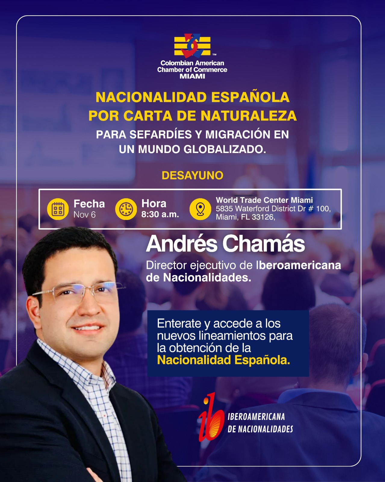 Este 6 de noviembre acompáñanos en un desayuno exclusivo donde conocerás, de la mano del experto Andrés Chamás, los nuevos lineamientos y oportunidades para acceder a la nacionalidad por carta de naturaleza, especialmente para sefardíes y migrantes en un mundo globalizado. 📍 World Trade Center Miami 🕣 8:30 a.m. Un encuentro organizado por la Colombian American Chamber of Commerce, diseñado para brindar información actualizada y crear conexiones clave entre profesionales y ciudadanos interesados en abrir nuevas fronteras. 🔗 ¡No pierdas esta oportunidad de informarte y conectar! more info... |