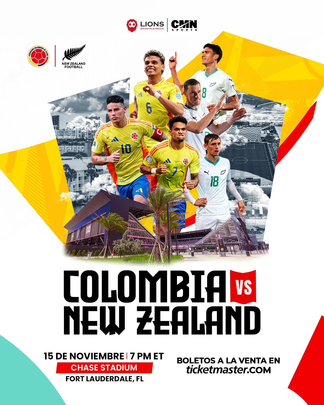 | 11/15/2025 | ¡No te pierdas este partidazo amistoso en suelo americano! La Selección Colombia se enfrenta a Nueva Zelanda en el Chase Stadium de Fort Lauderdale. ¡Prepárate para vibrar con la pasión del fútbol! Fecha: Sábado, 15 de noviembre de 2025 Hora: 7:00 PM Lugar: Chase Stadium, Fort Lauderdale, FL ¡Asegura tus entradas y ven a apoyar a la Tricolor! more info... |