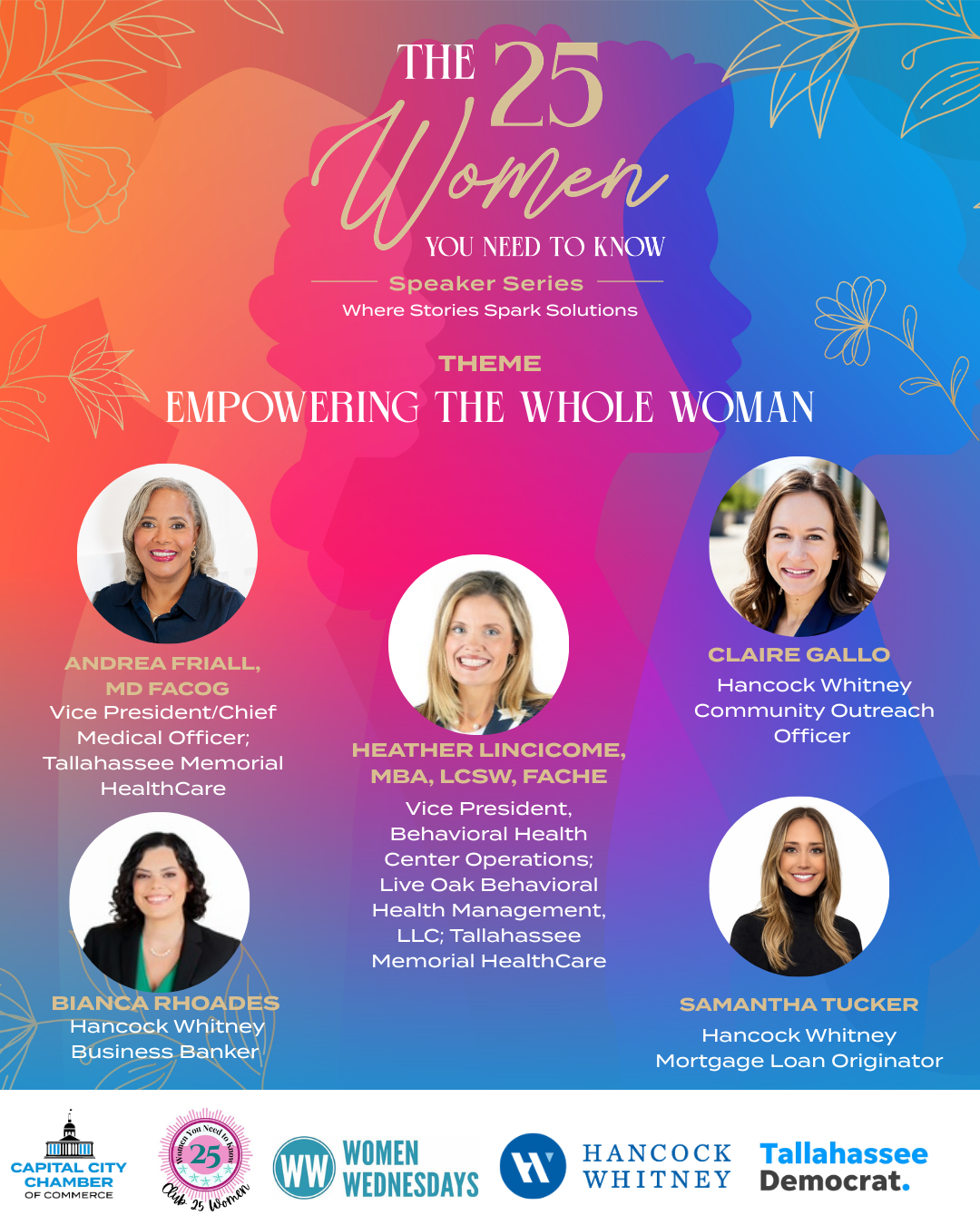 | 3/11/2026 | During Women’s History Month, on March 11th, we are proud to host Empowering the Whole Woman, with Hancock Whitney Bank as our presenting sponsor. This event is designed to provide a meaningful platform for women in business to share insights and expertise on topics that support their overall well‑being — including financial, physical, and mental health. Our featured health speakers include Dr. Andrea Friall and Heather Lincicome, who will offer valuable perspectives on women’s wellness. Thanks to the generous support of Hancock Whitney, this event is free to attend.
