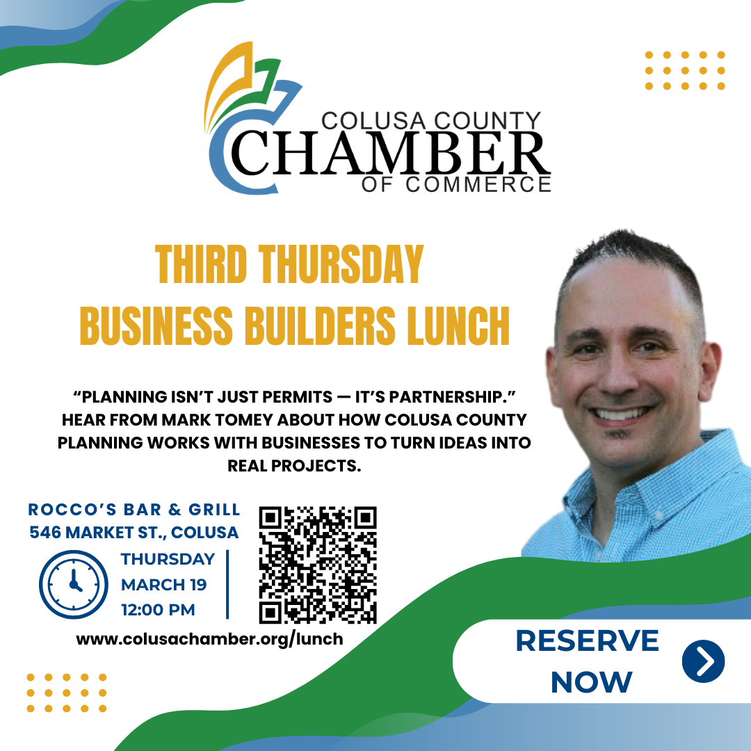 | March 19, 2026 | Join us for our next Business Builders Lunch featuring Mark Tomey, Chair of the Colusa County Planning Commission.