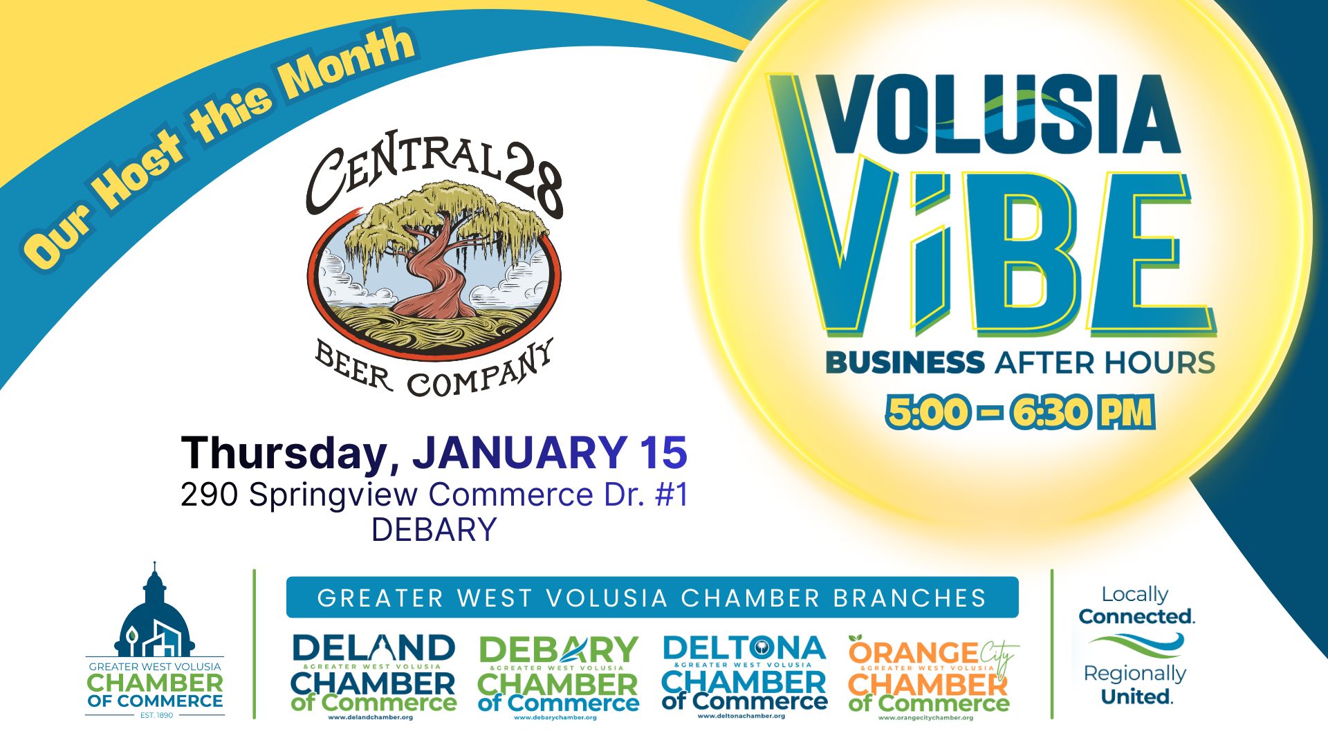 | 1/15/2026 | Unwind, connect, and catch the Volusia Vibe at our monthly Business After Hours networking event—bringing together Chamber members from across Greater West Volusia for an evening of conversation, collaboration, and community. Guests are welcome! Join us on Third Thursdays from 5:00–6:30 PM at various locations. Enjoy a relaxed atmosphere, meet fellow professionals, and strengthen relationships that move business forward. Bonus: The first 20 Chamber members to arrive will receive a complimentary drink! Whether you’re looking to grow your network, share ideas, or simply enjoy great company after hours, Volusia Vibe is the place to be. Your Greater West Volusia Chamber Network is regionally united and locally connected! more info... |