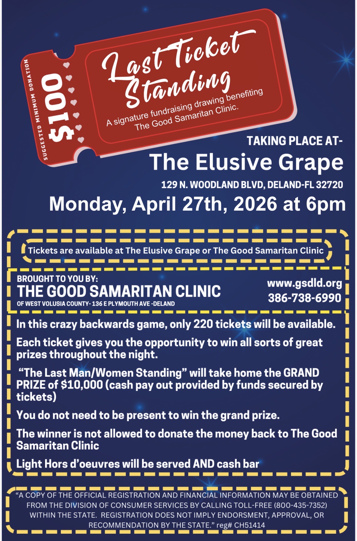 | 4/27/2026 | LAST TICKET STANDINGA signature fundraiser benefiting Suggested Minimum Donation: $100 Event DetailsMonday, April 27th, 2026 at 6:00 PM Taking Place At: Ticket InformationTickets are available at The Elusive Grape or The Good Samaritan Clinic. Event DescriptionIn this crazy backwards game, only 220 tickets will be available. Each ticket gives you the opportunity to win all sorts of great prizes throughout the night. “The Last Man/Woman Standing” will take home the GRAND PRIZE of $10,000 You do not need to be present to win the grand prize. The winner is not allowed to donate the money back to The Good Samaritan Clinic. Light hors d’oeuvres will be served and a cash bar will be available. Brought To You ByThe Good Samaritan Clinic of West Volusia County Website: www.gsdld.org “A copy of the official registration and financial information may be obtained from the Division of Consumer Services by calling toll-free (800-435-7352) within the state. Registration does not imply endorsement, approval, or recommendation by the state.”