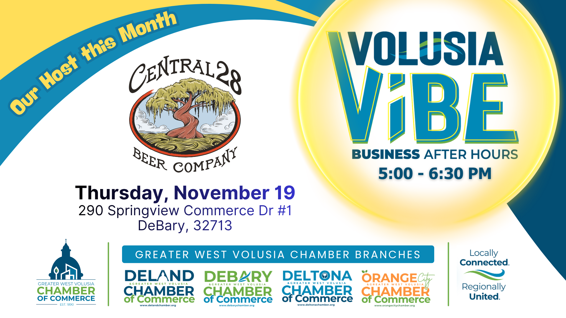 | 11/19/2026 | Unwind, connect, and catch the Volusia Vibe at our monthly Business After Hours networking event—bringing together Chamber members from across Greater West Volusia for an evening of conversation, collaboration, and community. Guests are welcome! Join us on Third Thursdays from 5:00–6:30 PM at various locations. Enjoy a relaxed atmosphere, meet fellow professionals, and strengthen relationships that move business forward. Bonus: The first 20 Chamber members to arrive will receive a complimentary drink! Whether you’re looking to grow your network, share ideas, or simply enjoy great company after hours, Volusia Vibe is the place to be. Your Greater West Volusia Chamber Network is regionally united and locally connected! more info... |