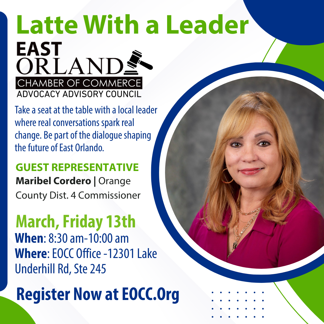 | 3/13/2026 | Exciting News from the East Orlando Chamber of Commerce! Our Advocacy Advisory Council is on a mission to champion pro-business initiatives that matter to YOU! By collaborating closely with our Board of Directors and using the Florida Chamber's six pillars as our foundation, we're dedicated to ensuring your voice is heard in policy discussions. Got ideas or issues you want us to address? We're all ears! Let's work together for a brighter business future in East Orlando and beyond. Program Sponsor ![]() more info... | ||||||||||||||||||||||||||||||||||||
