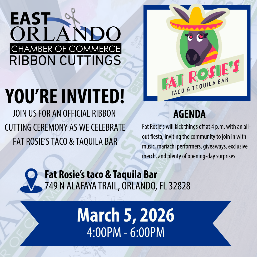 Join the East Orlando Chamber of Commerce as we celebrate the official ribbon cutting of Fat Rosie's Taco and Tequila Bar! ¡Vamos! Orlando’s lively food scene is about to get a whole lot louder. π