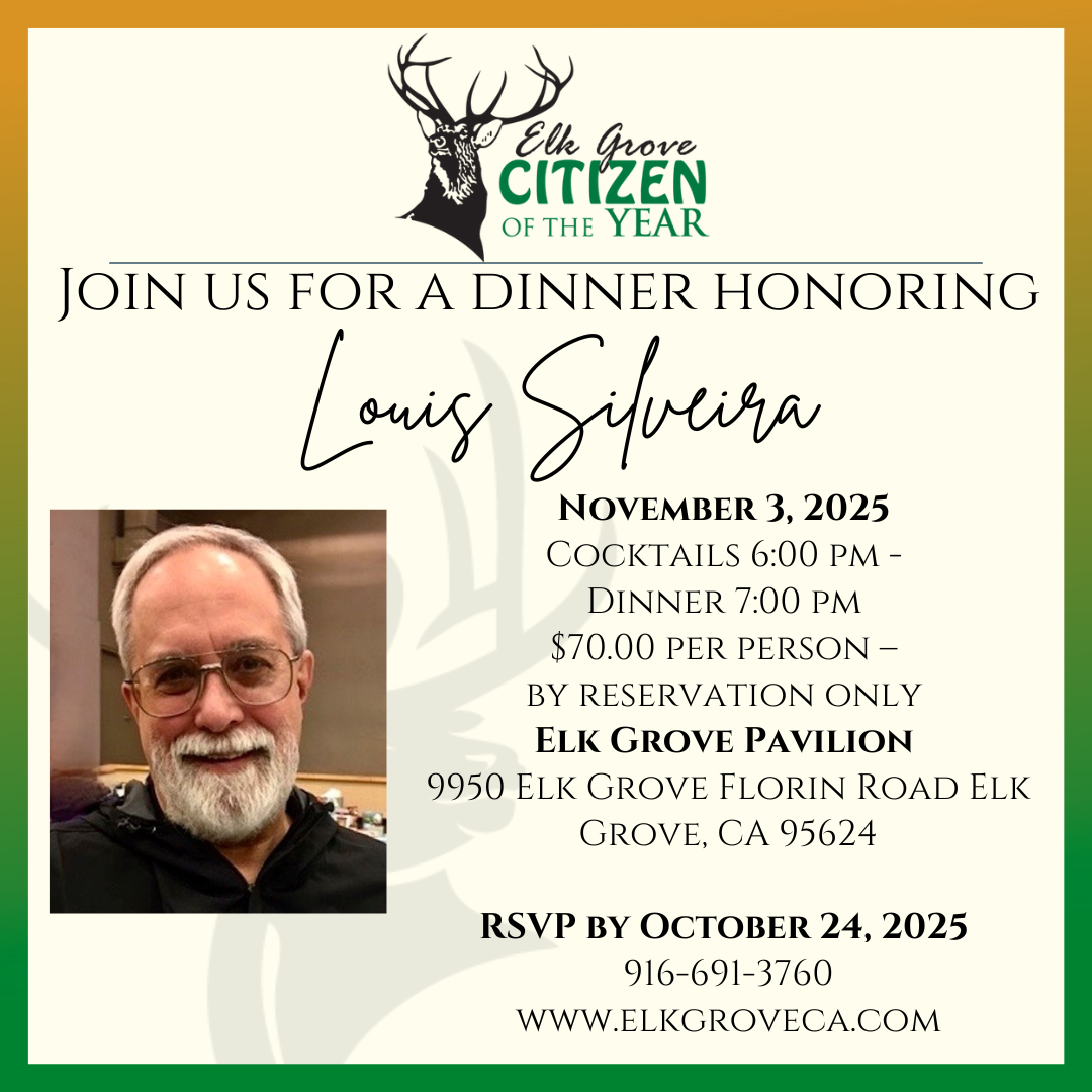 | 11/3/2025 | Louis Silveira’s story is deeply tied to Elk Grove. His family moved here in 1955, where he grew up on a ranch off Calvine Road before graduating from Elk Grove High School. After serving as a Navy medic, he built a 40-year career in the medical field with UC Davis. Beyond his profession, Louis is admired for his dedication to community service and local history. As The Elk Grove Citizen reported, he was recognized as “an immeasurable supporter of Elk Grove events and someone always willing to help others.” From creating the widely read Elk Grove High School Update newsletter to volunteering as webmaster, archivist, and photographer for the Elk Grove Historical Society, Louis has devoted himself to connecting people and preserving the stories that make Elk Grove unique. Join us on November 3, 2025 at the Elk Grove Pavilion as we honor Louis Silveira, the 2025 Elk Grove Citizen of the Year. Silveira has spent decades preserving local history, connecting neighbors through his Elk Grove High School Update newsletter, and serving countless community organizations. This special evening will celebrate his lifelong dedication to Elk Grove with cocktails at 6:00 PM and dinner at 7:00 PM. Referances: https://www.egcitizen.com/2025/09/16/546399/louis-silveira-named-citizen-of-the-year more info... |
