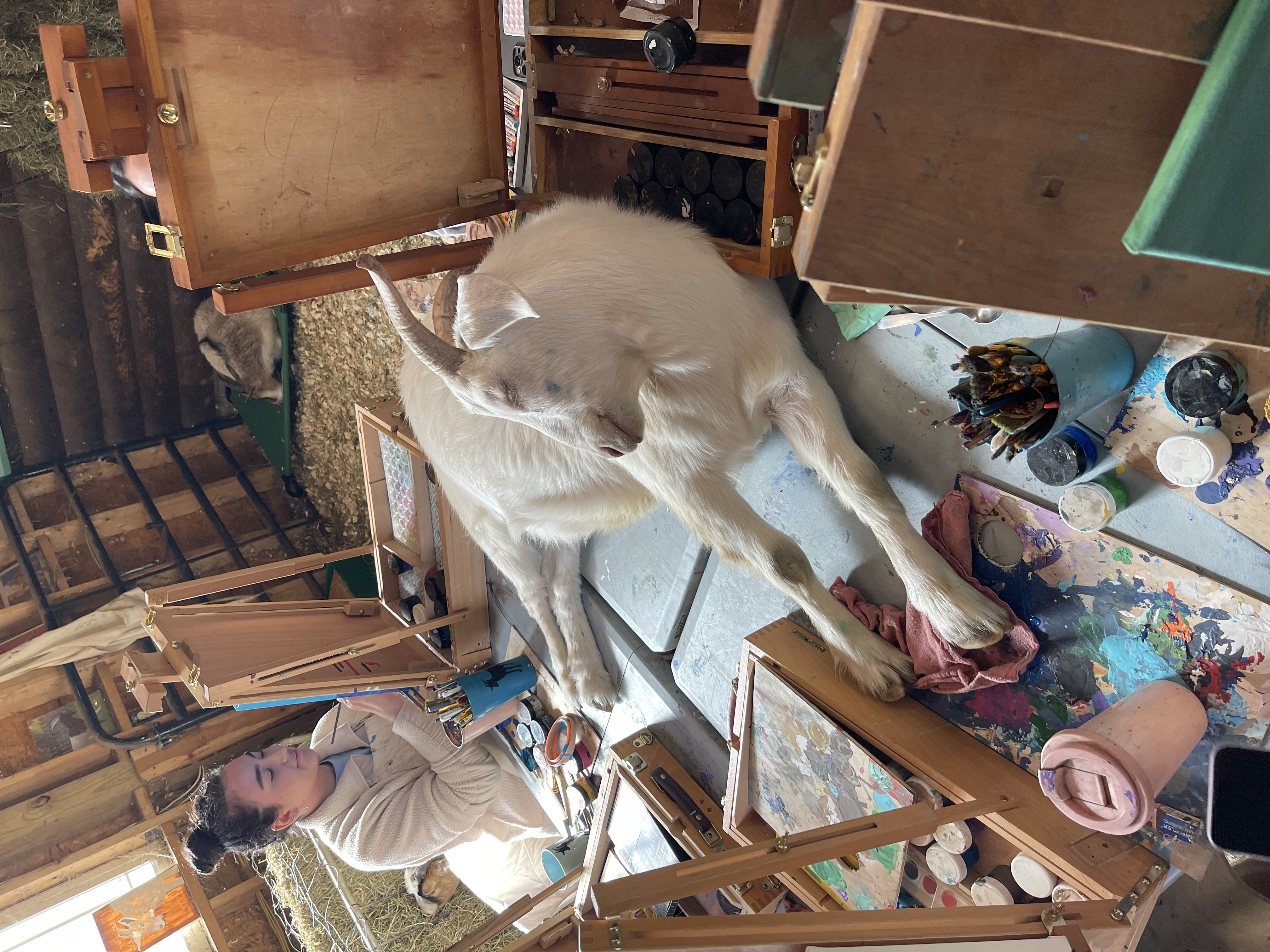 A brief introduction of the residents and the sanctuary mission is followed by setting up materials and getting creative. We can be as instructive or inspiring as each guest needs. Note that this isn't an art "class", but rather an opportunity to explore art materials and be expressive in a non-judgmental environment ... while surrounded by GOATS! We provide the art materials, complimentary beverages, ambience and the super cute, affectionate (and trouble-making) goats.