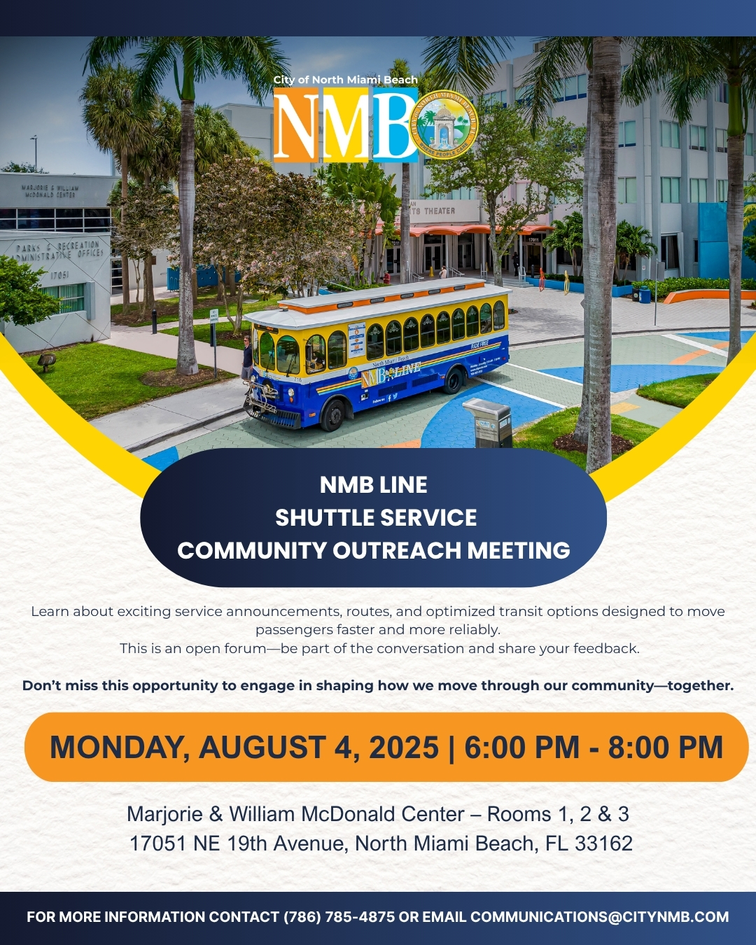 | 8/4/2025 | Monday, August 4 City of NMB open forum on Public Transportation & new shuttle service enhancements 6 pm to 8 pm McDonald Center Discover route changes, improved transit options, and service features designed to move passengers faster and more reliably. Your input is essential—be part of the conversation and share your feedback on how we can enhance public transportation in our community. |