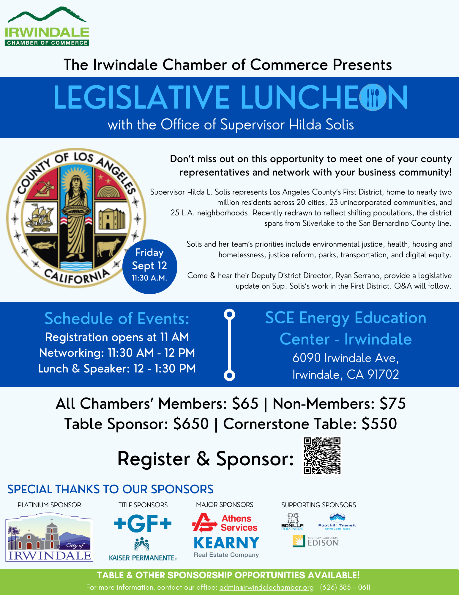 | 9/12/2025 | The Irwindale Chamber of Commerce invites you to our Legislative Luncheon with the Office of Supervisor Hilda Solis on Friday, September 12 from 11:30 AM to 1:30 PM at SCE Energy Education Center - Irwindale (6090 Irwindale Ave, Irwindale, CA 91702). This will be the third installment in our 2025 Legislative Luncheon series. Registration will open at 11:00 AM. Held quarterly, the Chamber's Legislative Luncheon series spotlights a public official from the City, County, State, or Federal level who will provide an update to attendees on key issues of the day and allow for conversation between Chamber Members and our local public officials. Come and hear Deputy District Director, Ryan Serrano, provide a legislative update on Sup. Solis' work in the 1st District. Q&A will follow. Don’t miss out on this opportunity to meet one of your county representatives and network with your business community! *Supervisor Hilda Solis will not be present at the event. PRICING: $65 for All Chambers' Members | $75 for Non-Members $650 Table Sponsor* | $550 Cornerstone Table* *Table sponsorship includes eight (8) seats, a sign prominently displaying your company logo, recognition in the event slides, and during the program. Table sponsorship is the only way to ensure sitting with your guests. 2025 Cornerstone members receive special pricing on sponsorship. NOTE: Should it be necessary for you to cancel your participation, any request by a registrant must be received in writing via email to admin@irwindalechamber.org. All requests MUST be received at least five (5) business days before the event. After that date, no refunds will be accepted, except in special circumstances. Thank you for your understanding. more info... |