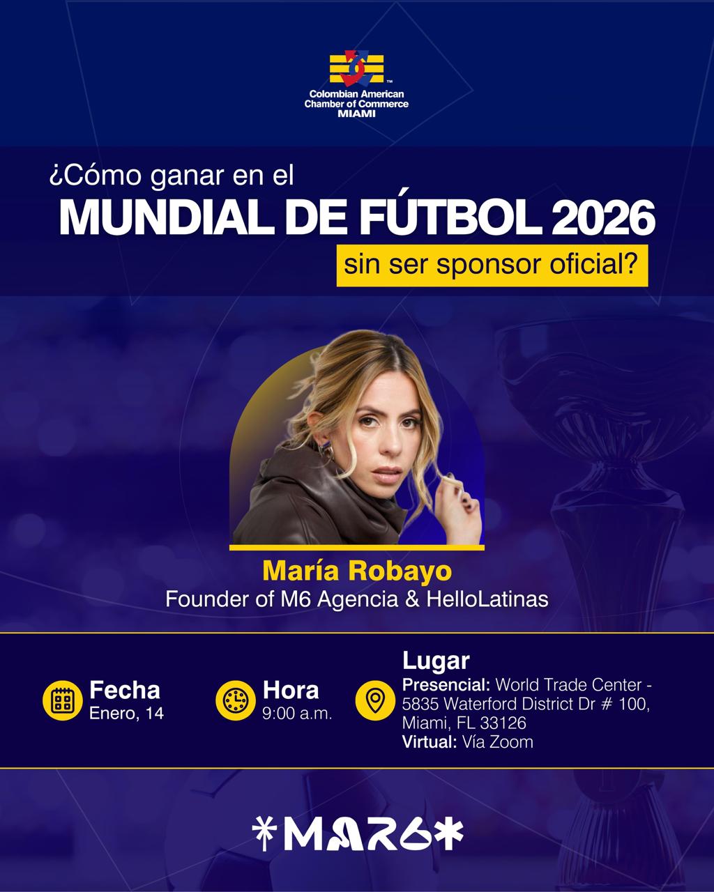 | 1/14/2026 | El Mundial de Fútbol 2026 no solo se juega en la cancha. También se gana con estrategia. ¿Cómo pueden las marcas y empresas capitalizar uno de los eventos más grandes del mundo sin ser sponsor oficial? Esta es la conversación que tendremos junto a María Robayo, Founder of M6 Agencia y HelloLatinas, en un encuentro diseñado para empresarios, líderes y marcas que quieren entender oportunidades reales alrededor del Mundial 2026. 📅 Enero 14, 2026 ⏰ 9:00 a.m. 📍 Evento híbrido Presencial: World Trade Center Virtual: 9:15 AM Vía Zoom: https://us02web.zoom.us/j/81898864903 Una charla para abrir la mente, entender el contexto y conectar con ideas estratégicas aplicables a negocios que piensan en grande. more info... |