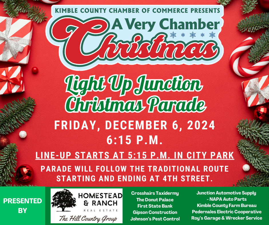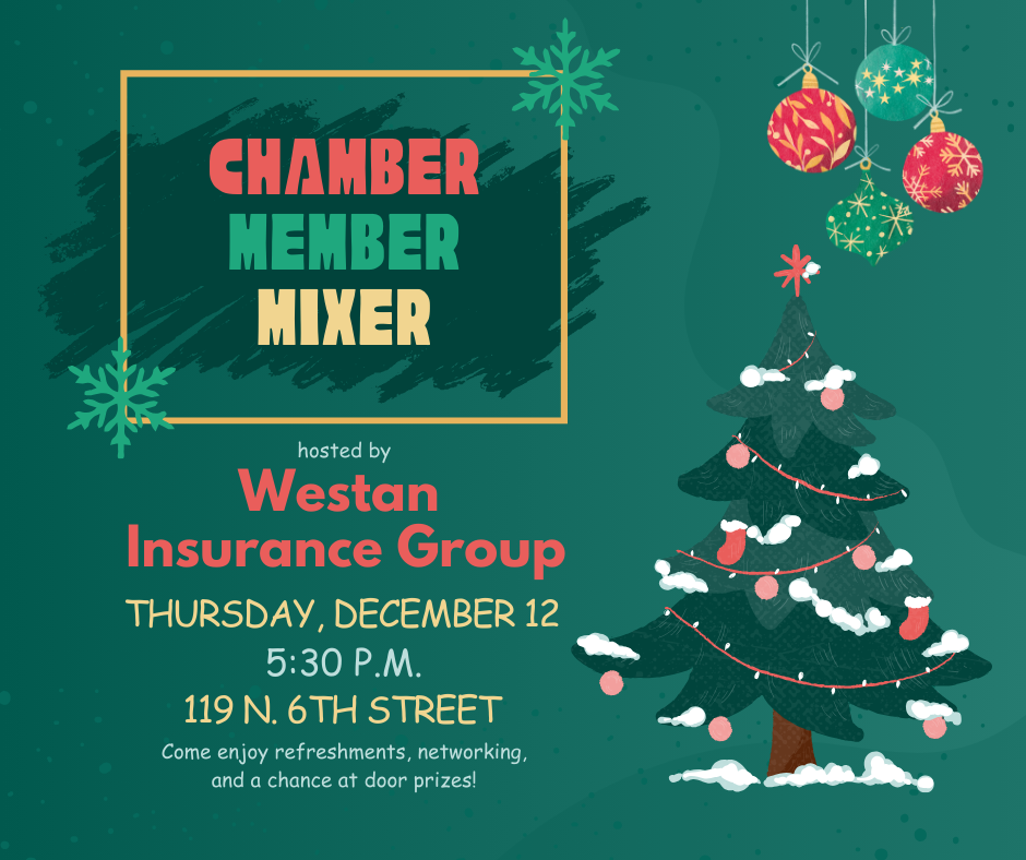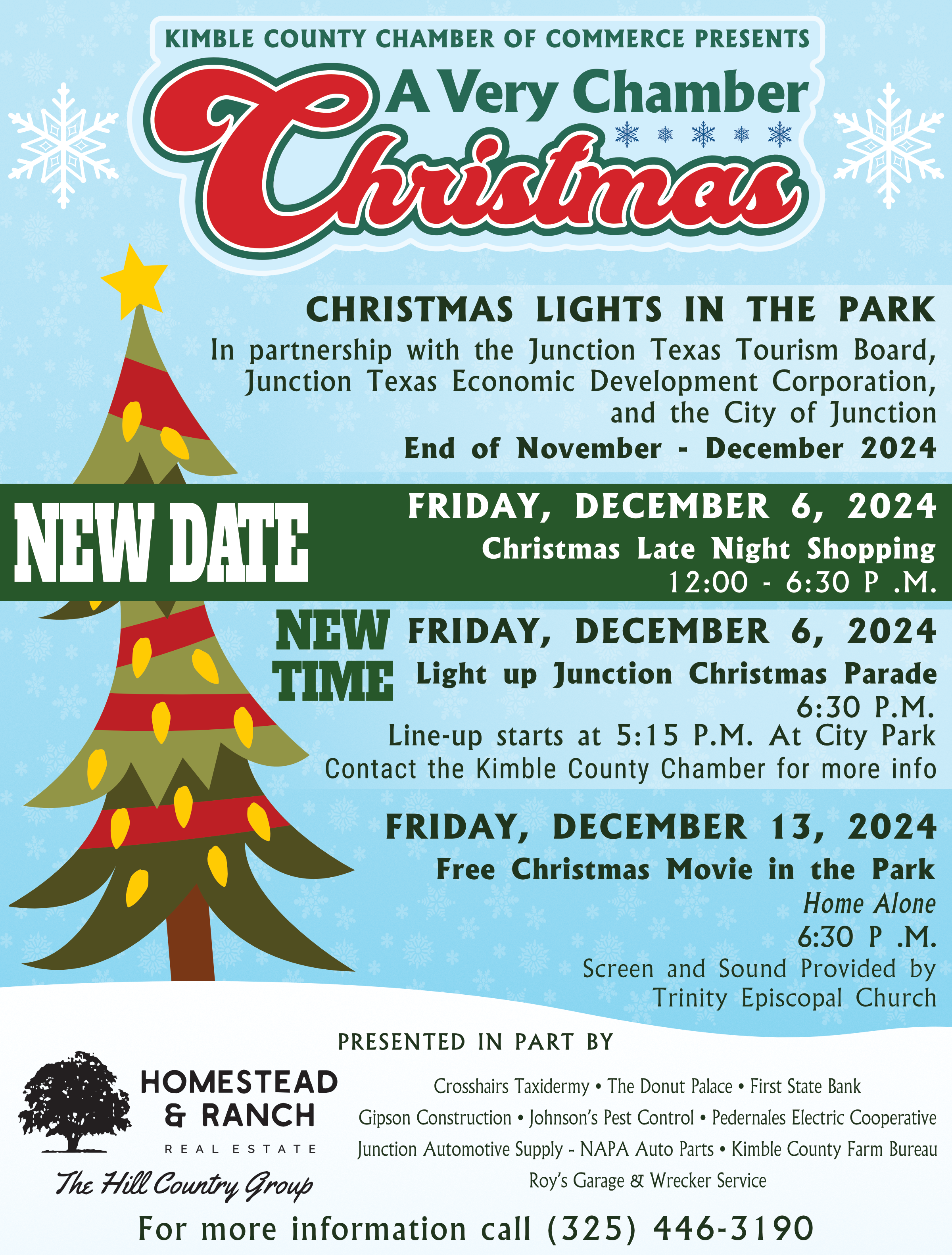 | 12/12/2024 | Join us at our next Chamber Member Mixer hosted by Westan Insurance Group on December 12, 2024, at 5:30 p.m. at 119 N. 6th St. in Junction! Enjoy great refreshments, networking, and a chance at winning a door prize. more info... |