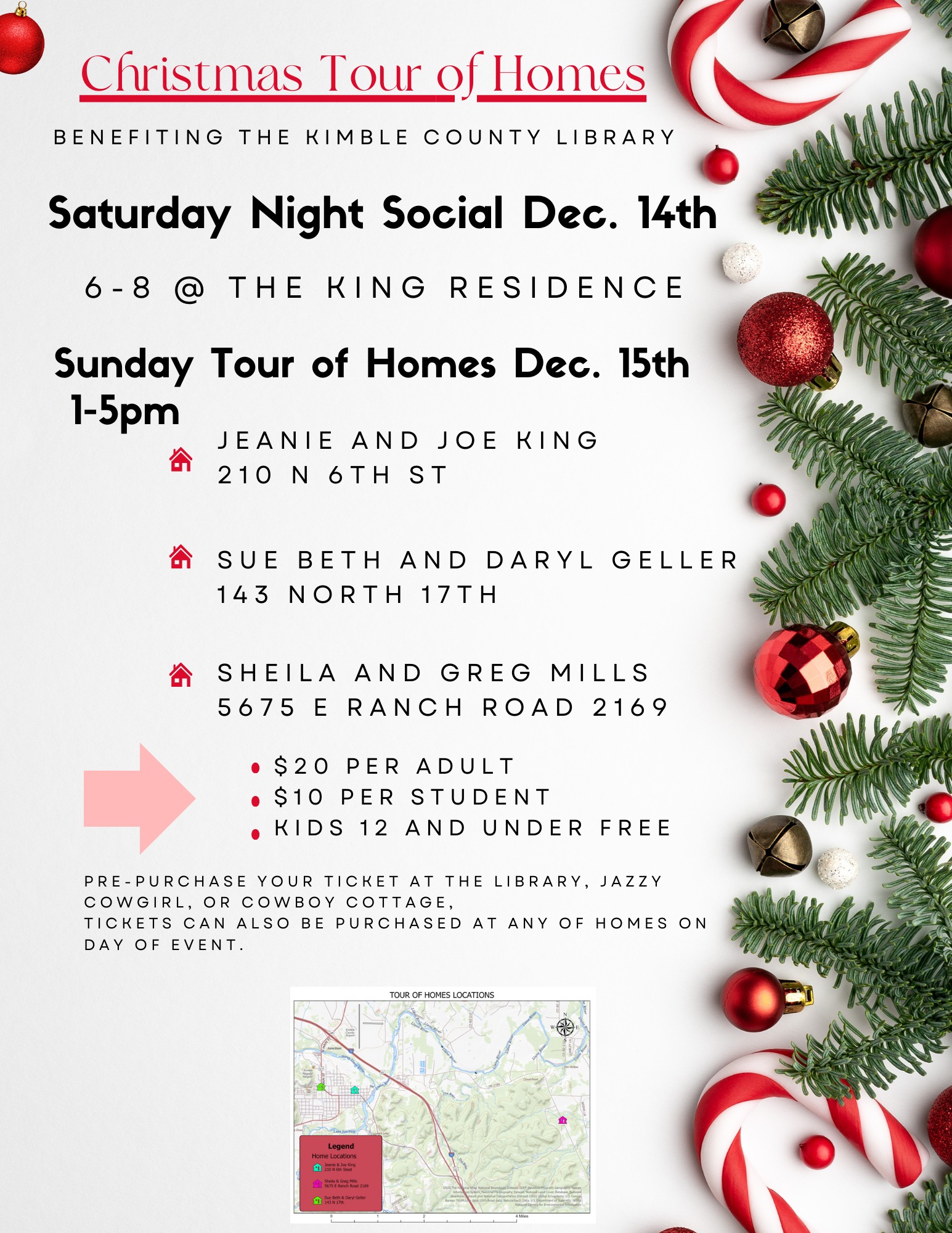 | 12/14/2024 -12/15/2024 | Come enjoy the Christmas Tour of Homes benefiting the Kimble County Library. Pre-purchase your ticket at the library, Jazzy Cowgirl, or Cowboy Cottage. Tickets can also be purchased at any of homes on day of event. See image below for full information. more info... |