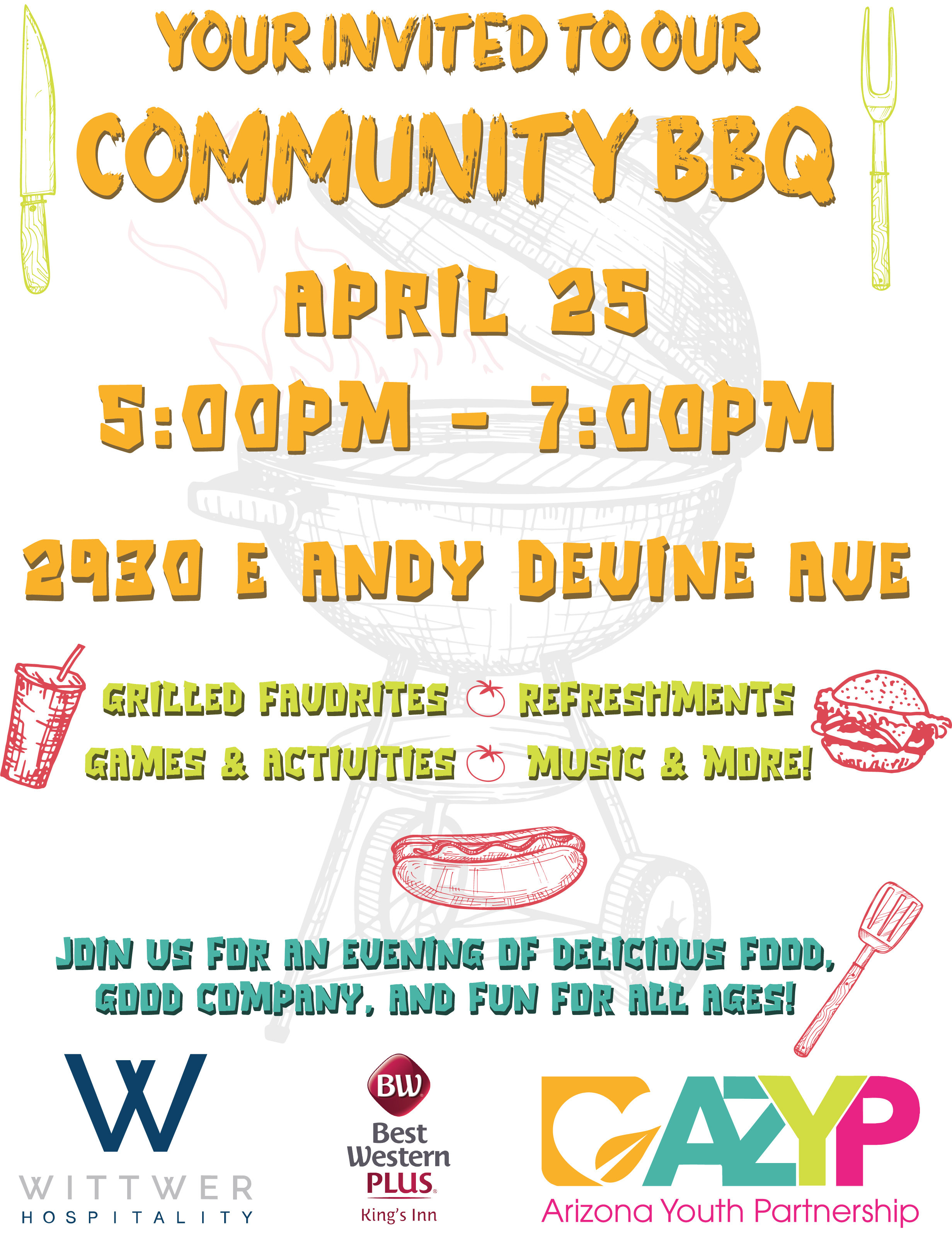 | 4/25/2025 | We’ve partnered with AZYP to help raise funds for their incredible program. Bring your friends, family, and appetite for a day of fun, food, and community spirit. Together, we can make a meaningful difference in the lives of those who need it most. more info... | ||||||||||||||||||
