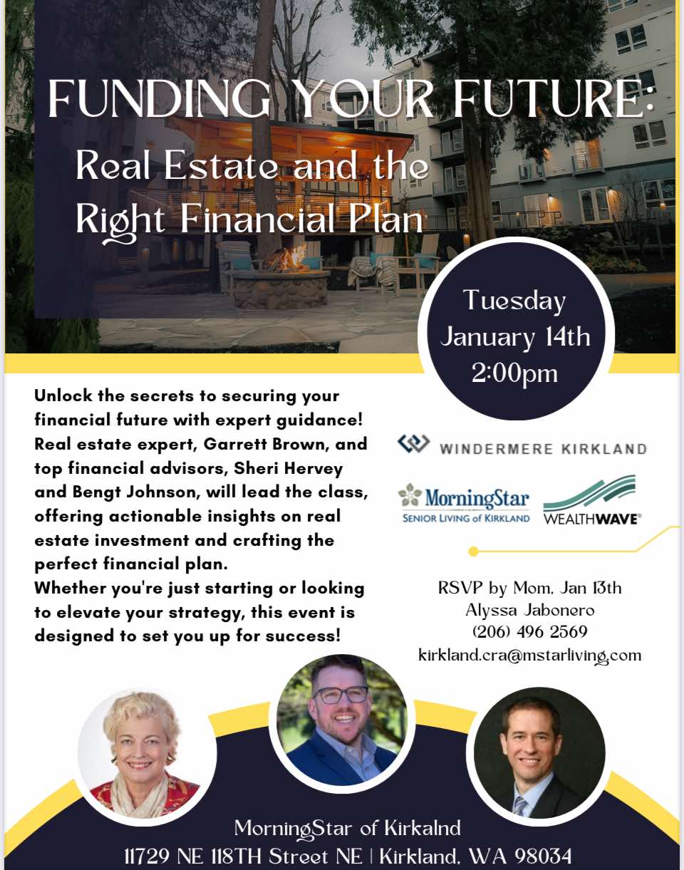 Unlock the secrets to securing your financial future with expert guidance! Real estate expert, Garrett Brown, and top financial advisors, Sheri Hervey and Bengt Johnson, will lead the class, offering actionable insights on real estate investment and crafting the perfect financial plan. Whether you're just starting or looking to elevate your strategy, this event is designed to set you up for success! Take this quiz to find out if downsizing is right for you. This event is held at MorningStar of Kirkland and is in collaboration with WealthWave and Garrett Brown Windermere Kirkland. RSVP by Monday, January 13th to Alyssa Jabonero at kirkland.cra@mstarliving.com or by phone at 206-496-2569 more info... |