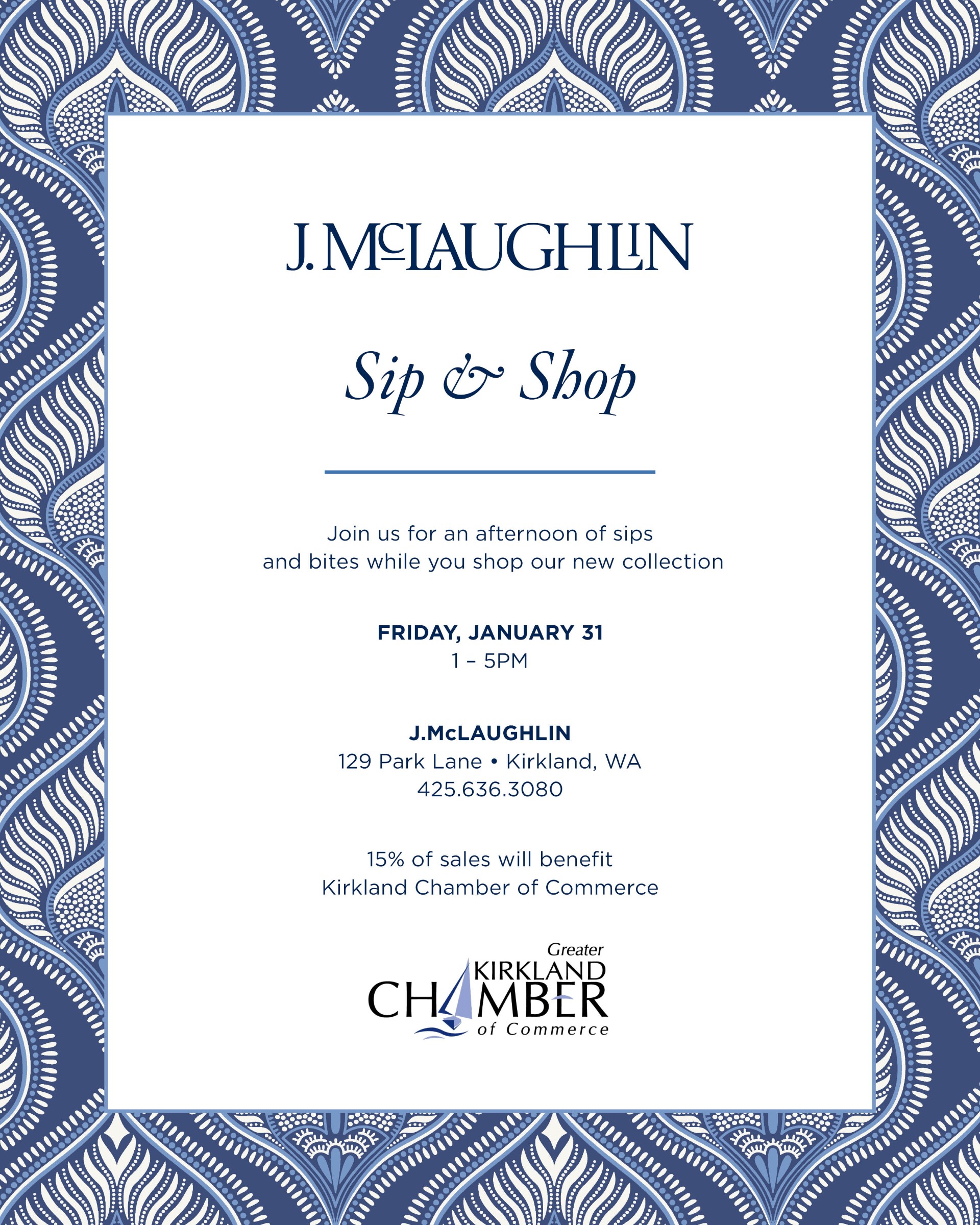 | 1/31/2025 | Well-known clothier and downtown Kirkland business, J.McLaughlin, has a long time history of supporting local organizations through it’s Sip and Shop Fridays. As part of its nationwide commitment, J.McLaughlin believes that each location has a responsibility to give back to the community it serves by partnering with a nonprofit of choice. This month, the Greater Kirkland Chamber of Commerce is thrilled to be the recipient of their 15% give back program on Friday, January 31st from 1:00 PM – 5:00 PM. It’s the perfect way to spend a Friday afternoon—enjoy light bites and refreshments while browsing their latest collection! Event Details: *Please note - this is only applicable at the J.McLaughlin Kirkland location on January 31st from 1:00 PM - 5:00 PM. more info... |