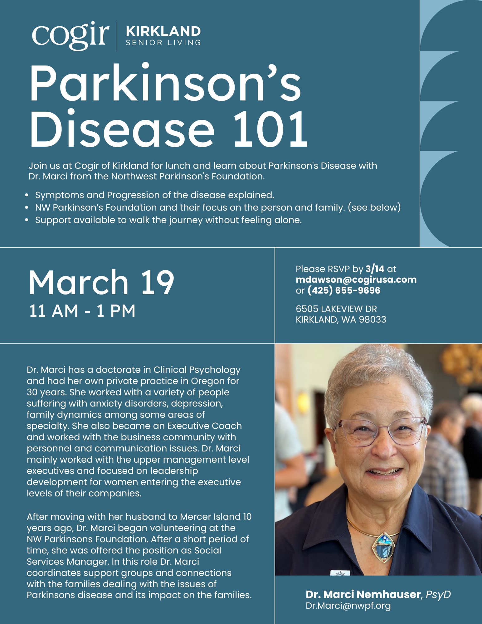 | 3/19/2025 | Parkinson’s Disease 101 March 19 11 AM - 1 PM Join us at Cogir of Kirkland for lunch and learn about Parkinson's Disease with Dr. Marci from the Northwest Parkinson's Foundation. Symptoms and Progression of the disease explained. NW Parkinson’s Foundation and their focus on the person and family. (see below) Support available to walk the journey without feeling alone more info... |