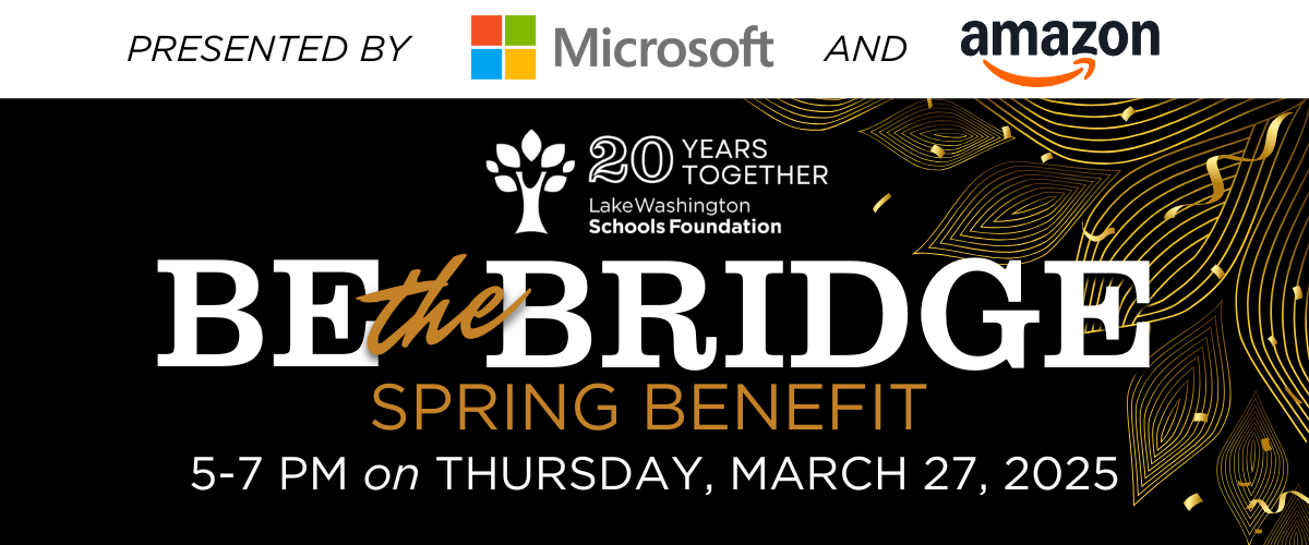 | 3/27/2025 | 20 Years of Impact. One Night to Celebrate!This year, Be the Bridge is more than just Lake Washington Schools Foundation’s biggest fundraiser—it’s a milestone celebration marking 20 years of making a difference for students in the Lake Washington School District! Register now to join community leaders, educators, and supporters for an inspiring evening of reflection, connection, and generosity. Enjoy drinks, appetizers, and meaningful conversations as we honor the past and build momentum for the future. WHAT: LWSF’s Be the Bridge Spring Benefit Event Schedule: