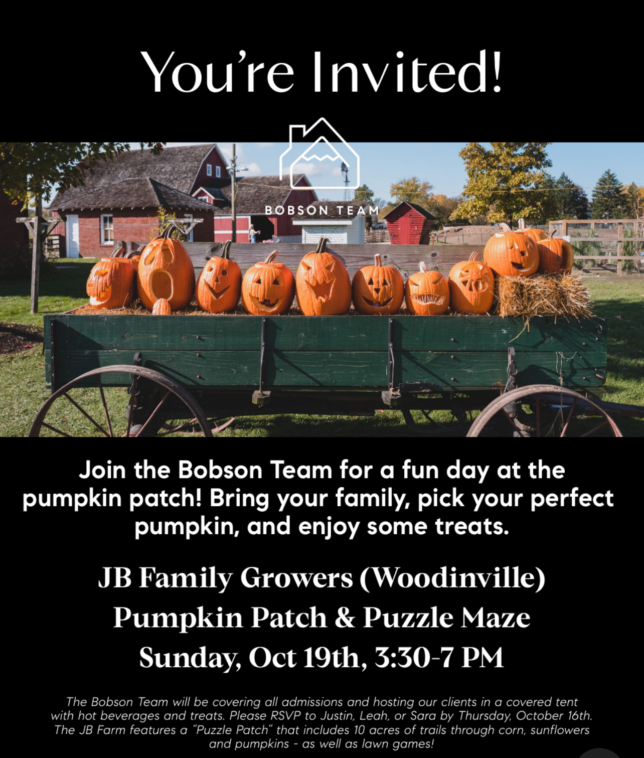 | 10/19/2025 | Join the Bobson Team for a fun day at the pumpkin patch! Bring your family, pick your perfect pumpkin, and enjoy some treats. JB Family Growers (Woodinville) Pumpkin Patch & Puzzle Maze Sunday, Oct. 19th, 3:30 p.m. - 7 p.m. The Bobson Team will be covering all admission and hosting our clients in a covered tent with hot beverages and treats. Please RSVP to Sara Bickel by Thursday October 16th. The JB Farm features a "Puzzle Patch" that includes 10 acres of trails through corn, sunflowers and pumpkins - as well as lawn games! Hope to see you there! more info... |