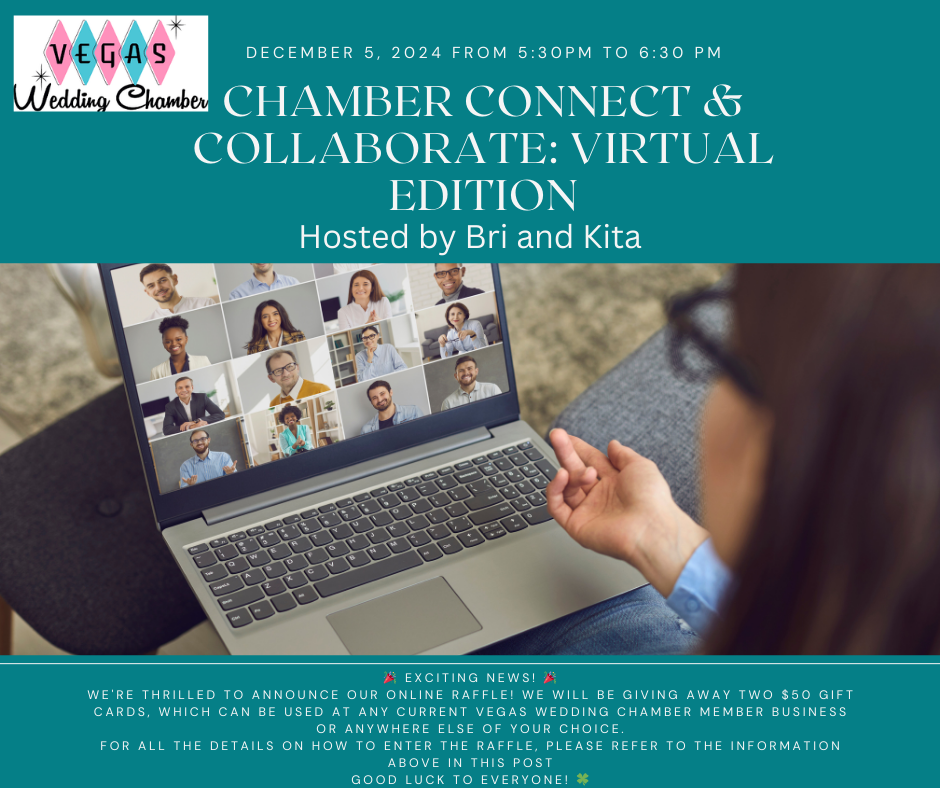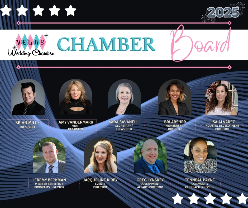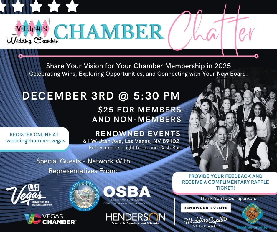 🎉 Calling all Members and Industry Leaders! 🎉Join us on Tuesday, December 3rd, 2024, for Chamber Chatter, an exciting evening dedicated to YOU—our valued Members and supporters. This is your opportunity to connect, collaborate, and celebrate as we come together to shape the future of the Vegas Wedding Chamber in 2025! What’s in Store?🌟 Meet the 2025 Board of Directors – Get to know the leaders who will guide us into the new year and share your thoughts on how we can grow and thrive together. Network with our Tourism Industry Special Guests