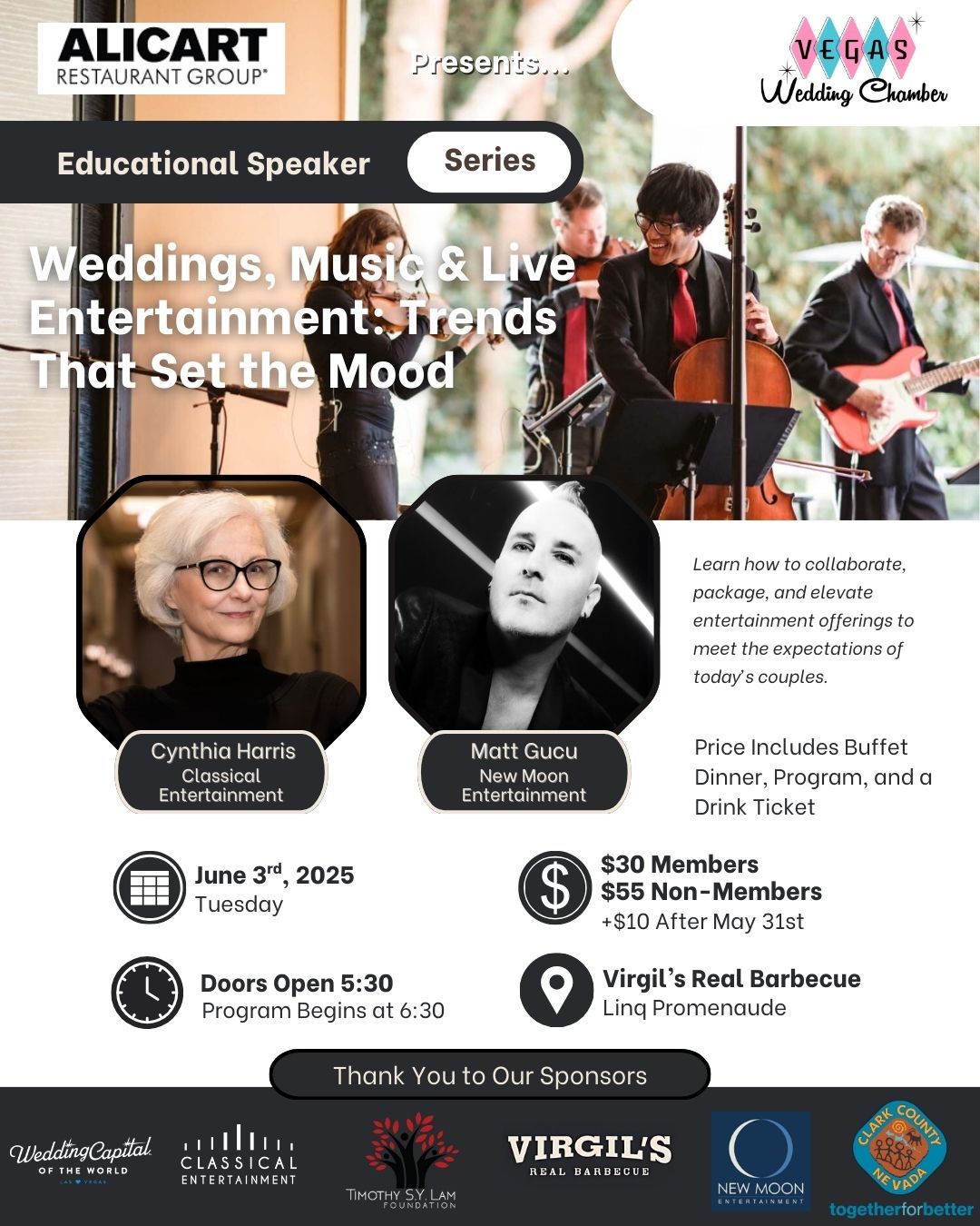 | 6/3/2025 | Educational Speaker Series: "Weddings, Music & Live Entertainment: Trends That Set the Mood"Presented by the Vegas Wedding Chamber and Alicart Restaurant Group Join the Vegas Wedding Chamber for our next Educational Speaker Series as we explore one of the most powerful elements of any wedding celebration: entertainment. From elegant live ceremony performances to fully produced, immersive reception experiences, this event will give you a front-row seat to the evolving role of music and performance in the wedding industry. Whether you're a vendor, planner, venue, or entertainer, this session will help you better understand how to collaborate, package, and elevate entertainment offerings to meet the expectations of today’s couples.