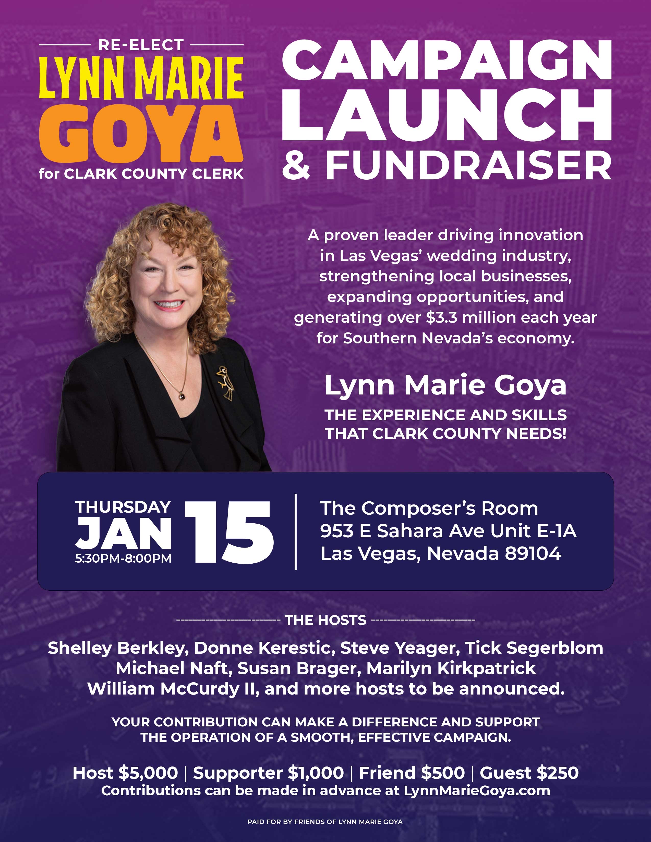 | 1/15/2026 | Re-Elect Lynn Marie Goya for Clark County ClerkMembers of the Vegas Wedding Chamber and community partners are invited to attend the Campaign Launch & Fundraiser for Lynn Marie Goya, as she seeks a third term as Clark County Clerk. As County Clerk, Lynn Marie Goya oversees services that touch nearly every resident and visitor interaction with county records — and she plays a particularly meaningful role in Southern Nevada’s wedding economy. Under her leadership, the Clerk’s Office has emphasized modernization, improved access, streamlined customer service, and operational efficiency, supporting both local residents and the many couples who travel to Las Vegas to marry. This campaign launch is an opportunity for Chamber members to hear Lynn Marie Goya’s vision for the future, connect with civic and community leaders, and engage in conversation about the importance of effective public service in a region where government operations and tourism-driven industries work closely together. Hosted By: