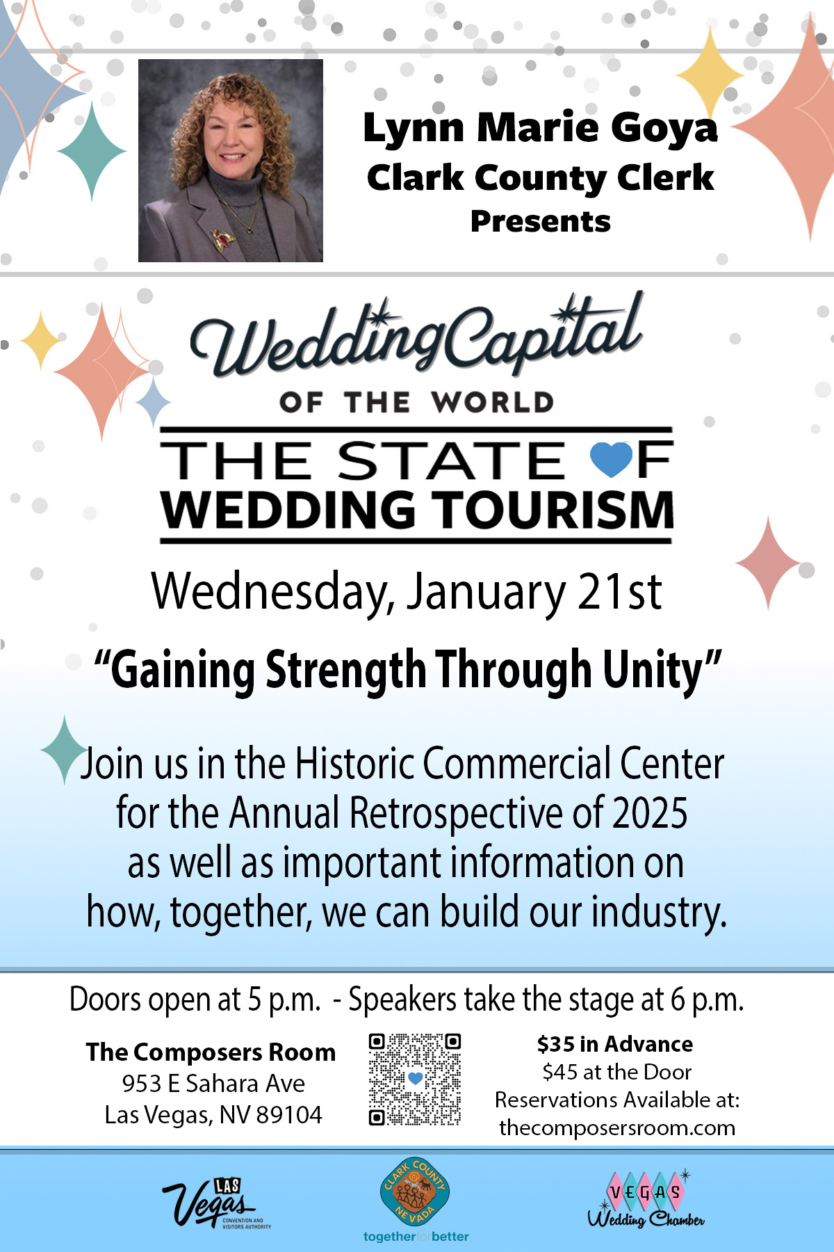 | 1/21/2026 | State of Wedding Tourism, “Gaining Strength Through Unity”Join Clark County Clerk Lynn Marie Goya at The Historic Commercial Center for the annual State of Wedding Tourism, “Gaining Strength Through Unity.”more info... |