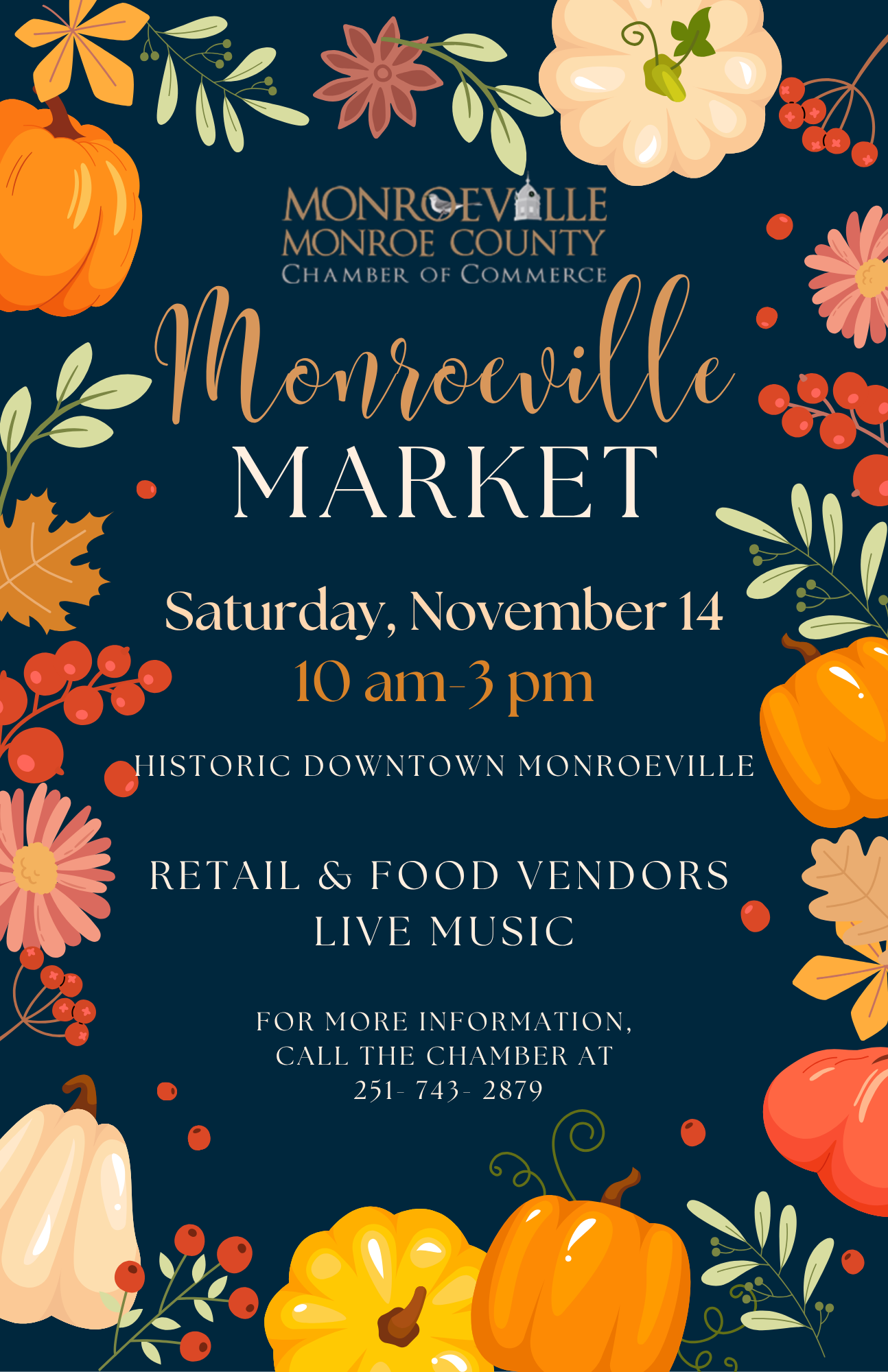 | 11/14/2026 | The annual Monroeville Market will take place in downtown Monroeville on the square on Saturday, November 14, 2026 from 10 am until 3 pm. Vendor registration may be found on the Chamber's website monroecountyal.com. Registration will open in September. Questions? call the Chamber at 251-743-2879. more info... |