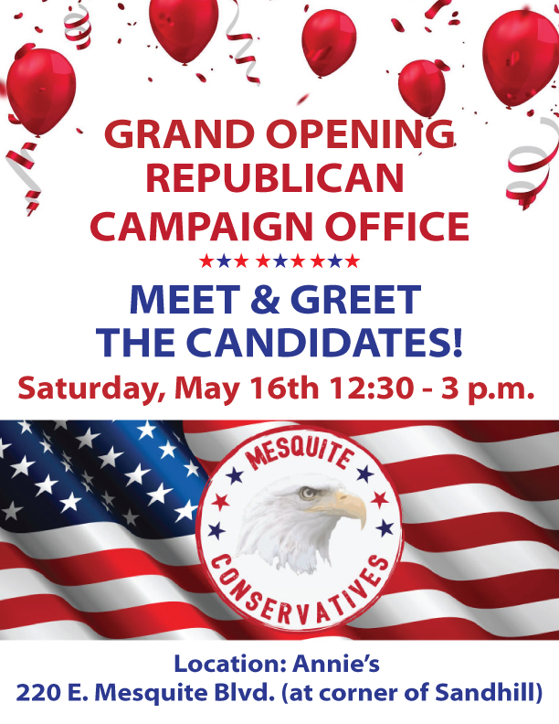 followed by an audience Q&A. Social begins at 5pm and gavel goes down at 5:30pm for our speaker, with club business to follow. All Republicans and conservatives, Men and Women, are invited to our monthly meetings the 2nd Wednesday at the Mesquite Veteran Center, 840 Hafen Lane (at Riverside) more info... |