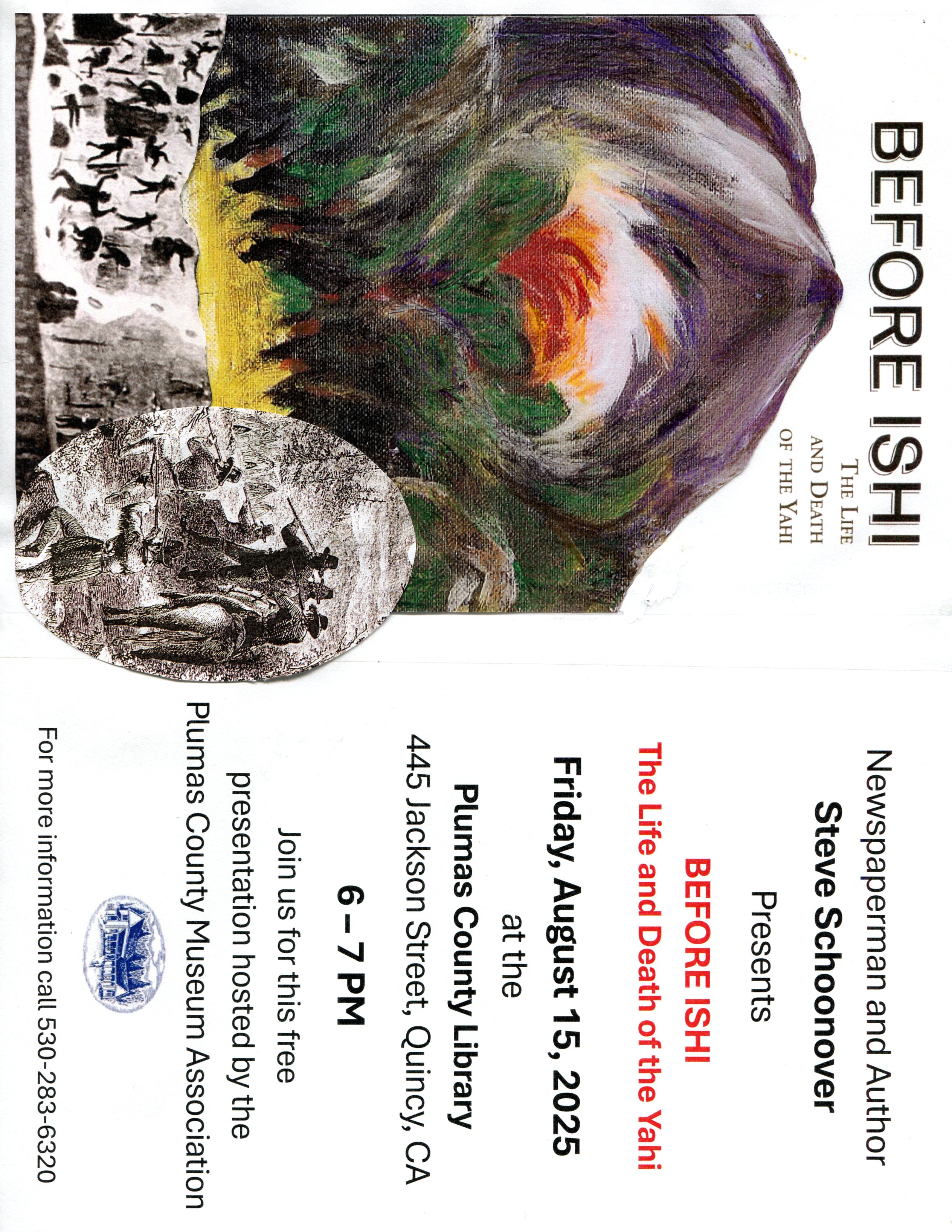 | 8/15/2025 | Presented by the Plumas County Museum Association, newspaperman and author Steve Schoonover will be reading a passage from his new novel, Before Ishi: The Life and Death of the Yahi. Schoonover will also be signing copies and discussing the book. more info... |