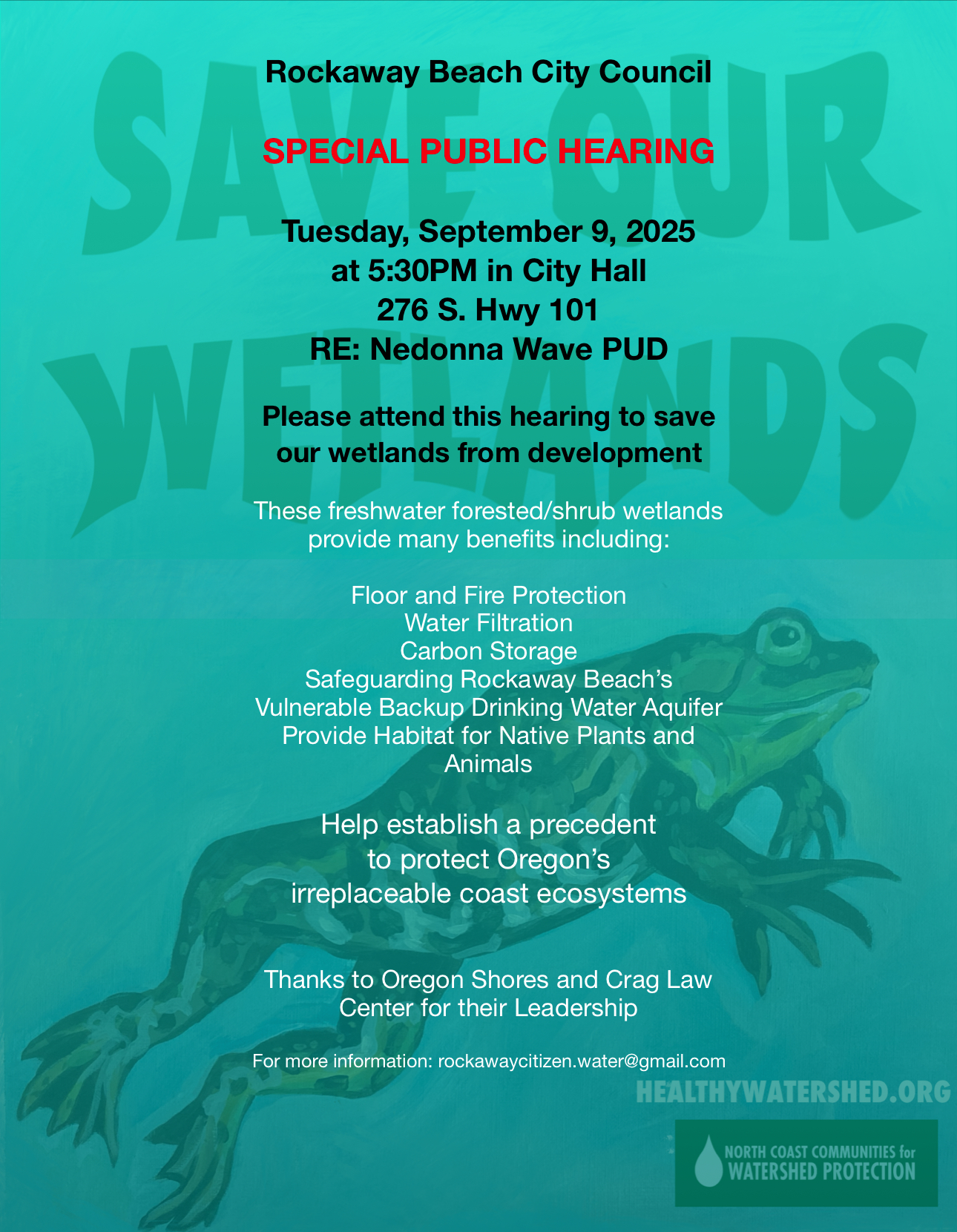 | 9/30/2025 | To all members, City Council and the community: Thank you! On September 9, the Rockaway city Council denied the application for the development proposed in the Nedonna wetland/watershed. Your voices, time and energy resulted in something positive. Thanks to all of your efforts together we made a critical step towards protecting coastal wetlands. Special thanks to Crag Law Center and Ocean Shores. Please attend our next community meeting on September 30 at 6 to 7 PM at St. Mary by the Sea Parish, 275 South Pacific St. Rockaway Beach. For more information: rockawaycitizen.water@gmail.com more info... |