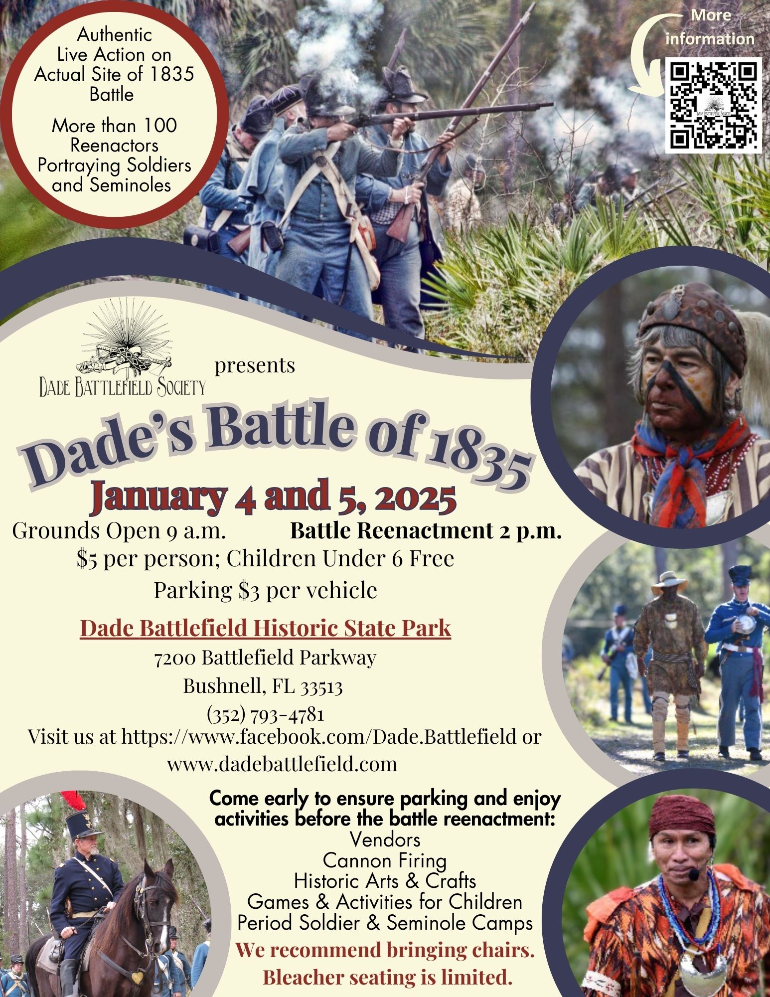 | 1/4/2025 -1/5/2025 | Commemorating the 189th Anniversary of Dade's Battle of 1835, the beginning of the Second Seminole War. Reenactment includes period soldier, Seminole and civilian camps, period vendor trade fair, historic arts and crafts demonstrations and full-scale cannon firing plus 19th century games and activities for children. more info... |
