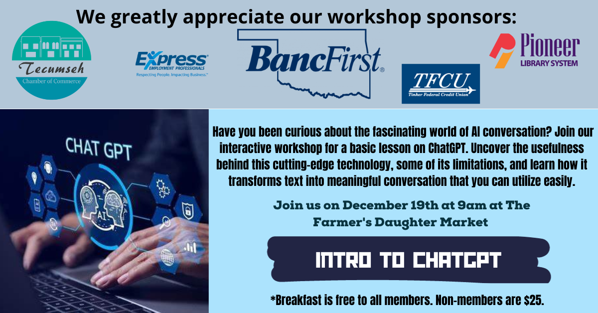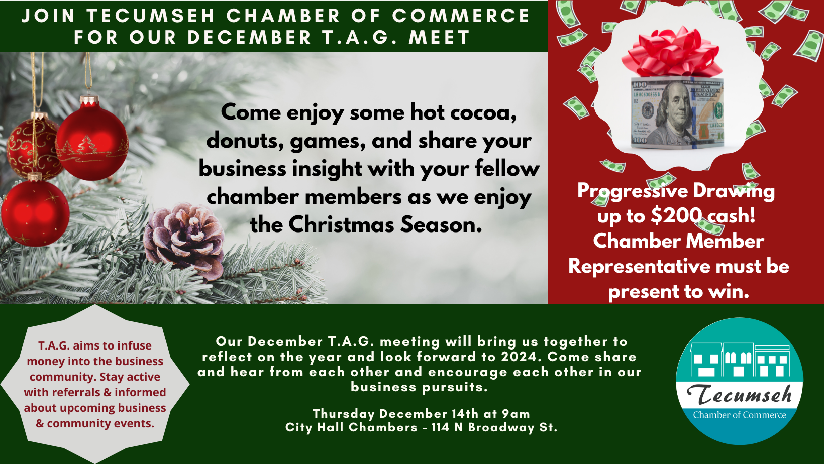 | 12/13/2023 | The Chamber board meetings happen the second Wednesday of each month and are open to the public. The agenda will be posted at City Hall 24 hours prior to any meeting. |