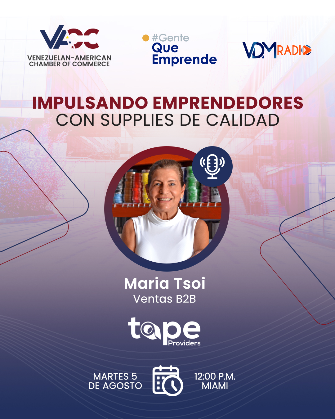| 8/5/2025 | Esta semana en #GenteQueEmprende, recibiremos a Maria Tsoi, experta en el área de ventas B2B en Tape Providers, una empresa con 18 años de experiencia dedicada a la distribución y manufacturación de suministros de almacén.
