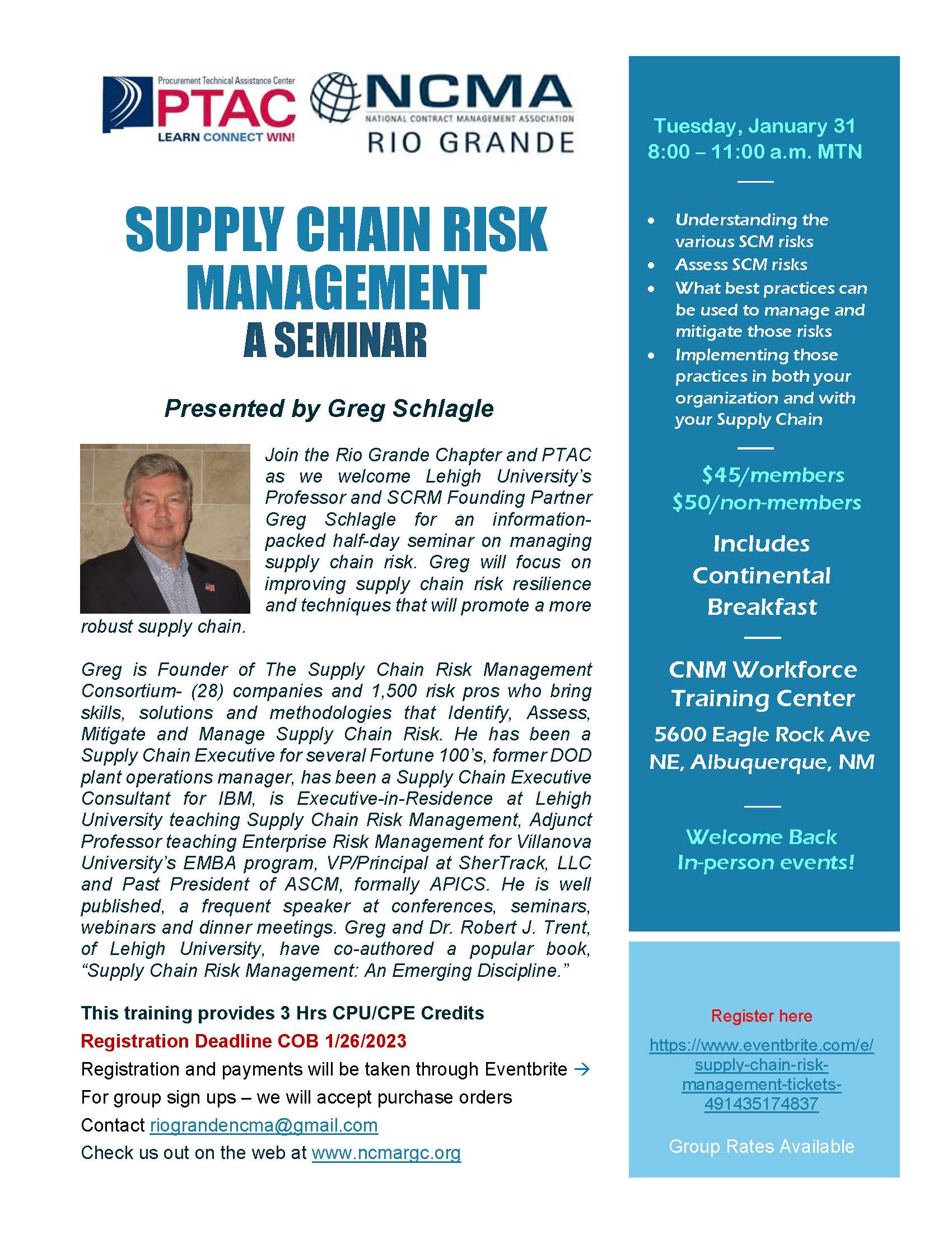 Please join the Rio Grande Chapter as we welcome Lehigh University’s Professor and SCRM Founding Partner Greg Schlagle for an information-packed half-day seminar on managing supply chain risk. Greg will focus on improving supply chain risk resilience and techniques that will promote a more robust supply chain.