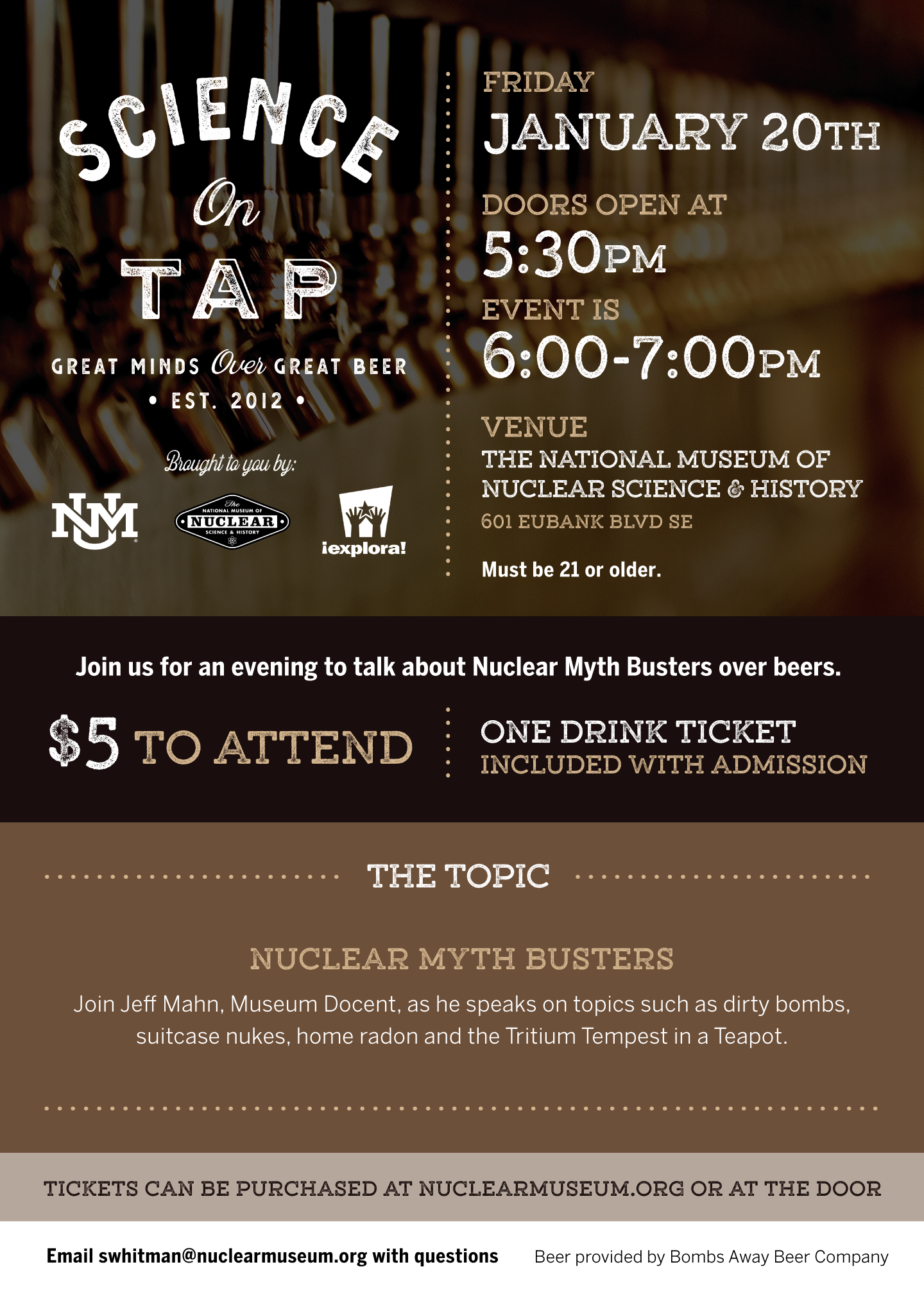 "Science on Tap," a series of informal talks on a wide range of topics in science and technology, will continue on Friday, January 20th, and doors open at 5:30 pm, with the event taking place from 6-7 pm, at the National Museum of Nuclear Science & History. The talks are co-sponsored by the University of New Mexico, Explora! and the National Museum of Nuclear Science & History. Admission is $5 per person, and you must be 21 years to attend. Admission will provide each guest with one beer ticket for Bombs Away Beer Company, and additional drinks can be purchased at the expense of the visitor.
