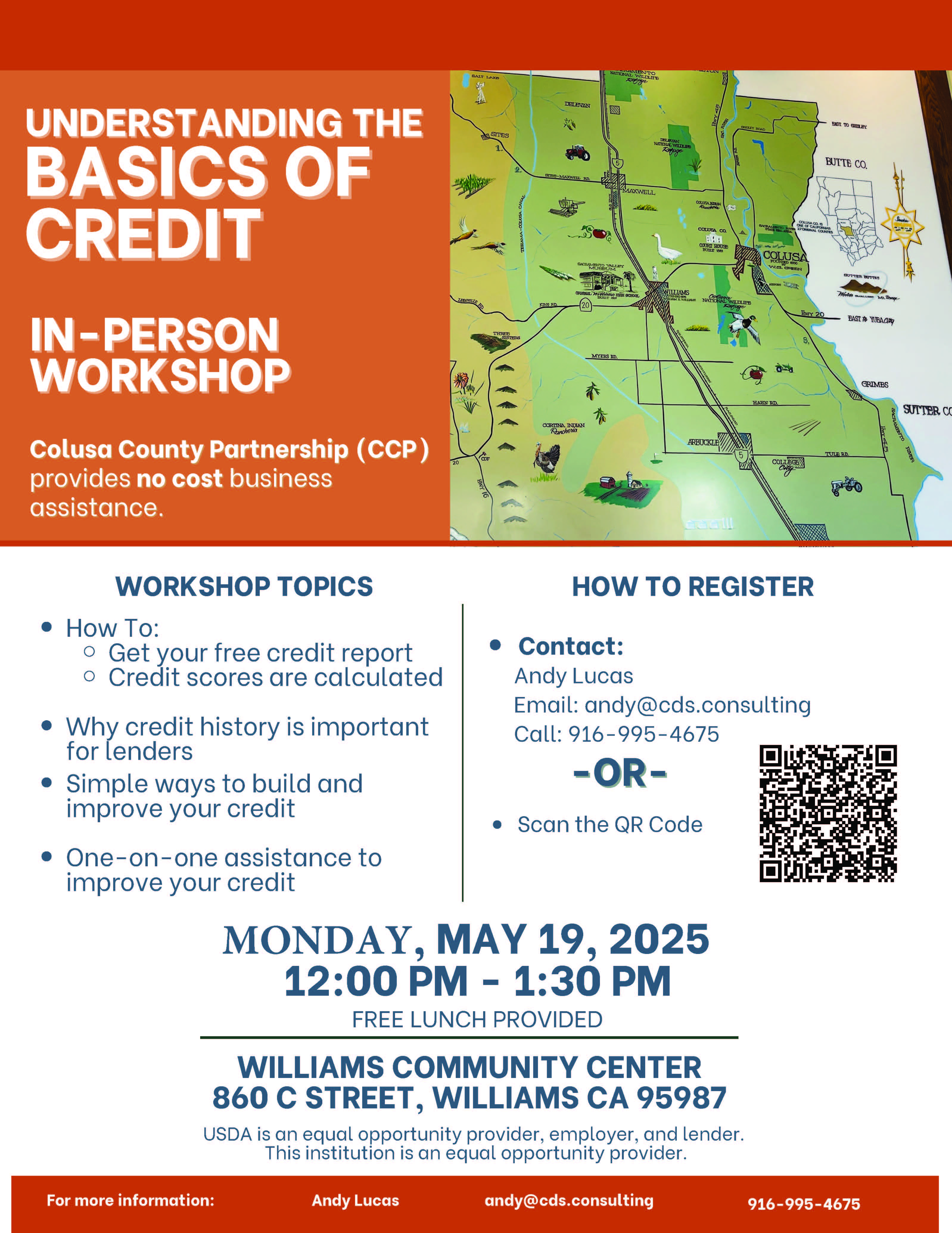 Join the Colusa County Partnership for an informative event where they will delve into the basics of credit. Whether you’re new to credit or looking to enhance your knowledge, this event is perfect for you. Andy Lucas (CDS Consulting) will cover topics such as how to get your credit report, why credit history is important to lenders and simple ways to improve your credit. See the flier below for contact and registration information. May 20, 2025