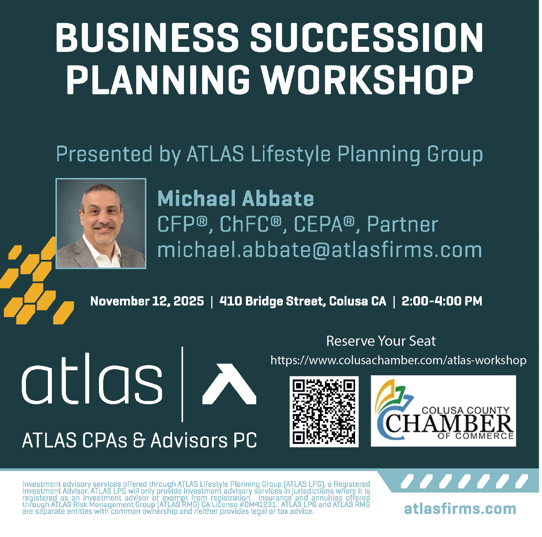 ATLAS CPAs & Advisors PC invite you to their upcoming workshop, Business Succession Planning. All business owners should have a succession plan to provide for the security of your business in view of life events. This workshop is being conducted by Maichael Abbate of the ATLAS Lifestyle Planning Group. The Colusa County Chamber encourages our members to take advantage of this opportunity. Please reserve your seat with this invitation or www.colusachamber.org/atlas-event.
