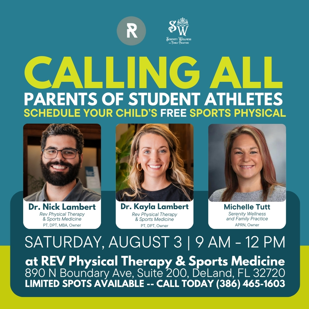 Rev Physical Therapy & Sports Medicine and Serentiy Wellness and Family Practice will be offering FREE Physical Exams for any athlete looking to participate in the upcoming 2024/2025 season.