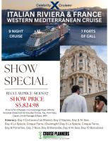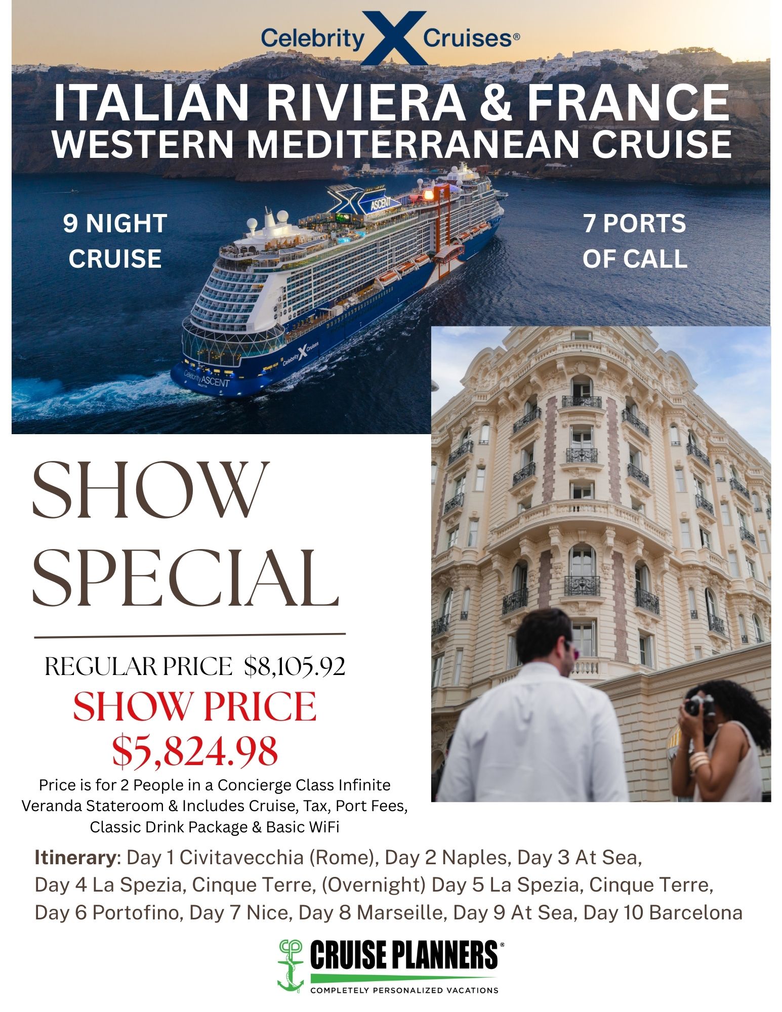 Italian Riviera & France Mediterranean Cruise Set sail on the Celebrity Equinox for an unforgettable Mediterranean journey through Italy, France, and Spain! Explore the timeless beauty of Rome\\\\\\\'s ancient wonders, the romantic streets of Nice and Provence, and the vibrant culture of Barcelona, all while enjoying Celebrity\\\\\\\'s award-winning luxury at sea. With world-class dining, upscale amenities, and breathtaking views, this cruise is the perfect way to experience Europe in style. Reserve your spot today and let your Mediterranean adventure begin! See our Information Flyer with Pricing at: https://www.chamberorganizer.com/members/classifieds_file.php?cid=38711417 City: Orlando State: FL Zip: 32714 W: 407-800-6100 visit our website... chris.buxton@cruiseplanners.com Contact: Christopher Buxton File attached to this ad |
