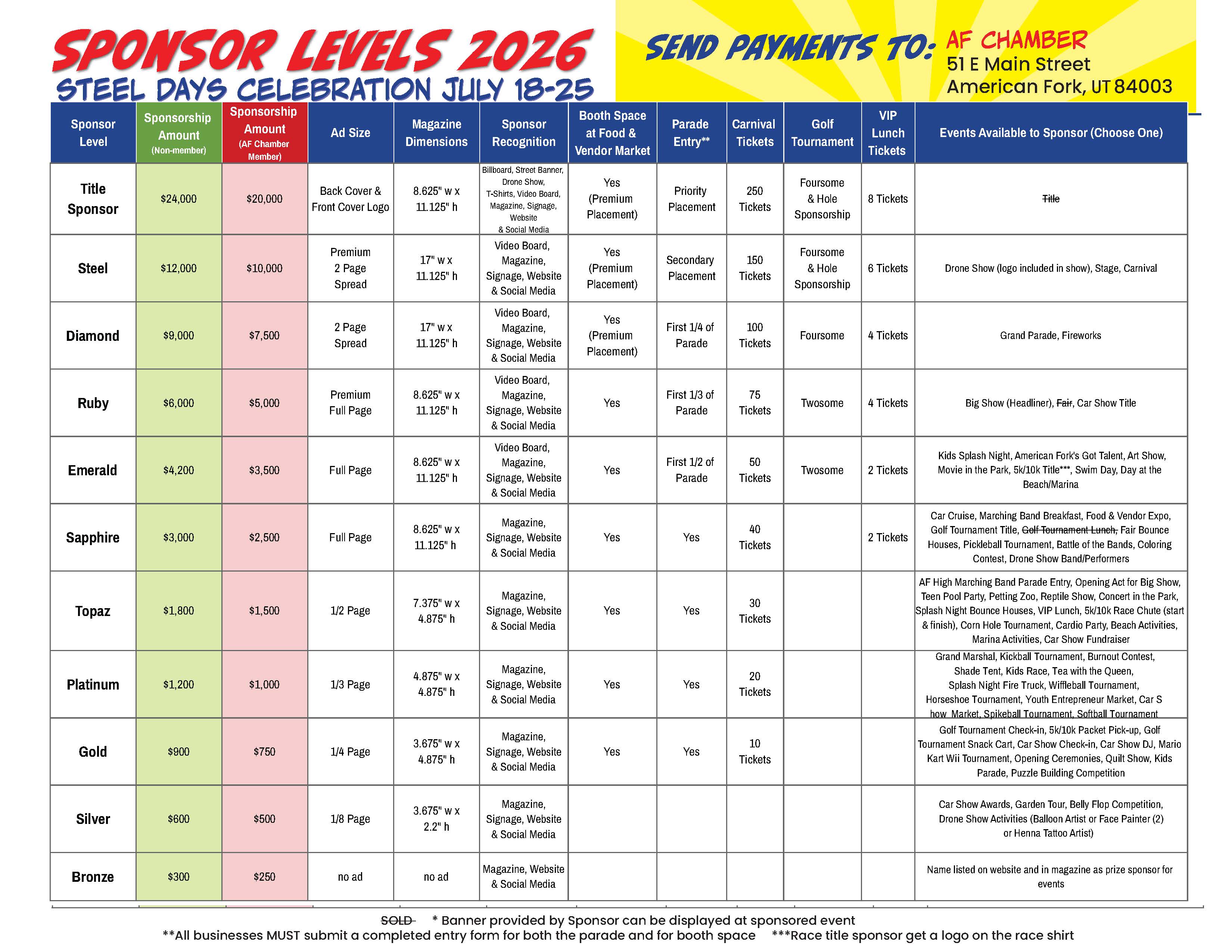 Sponsorship opportunities are now open, and many businesses are already securing their spots. We want to make sure you have the opportunity to be part of the highest-attended community celebration in American Fork.