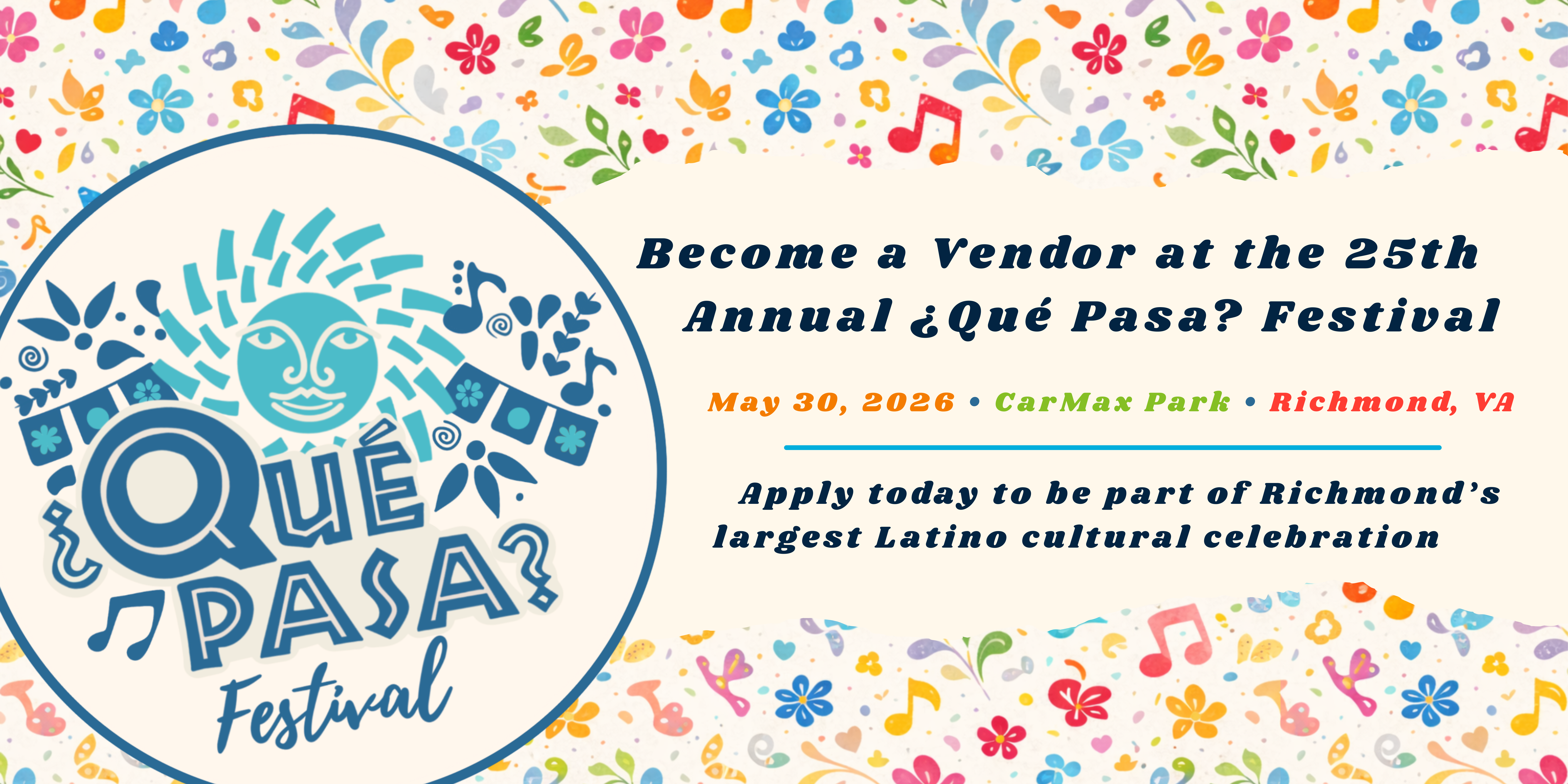 Thank you for your interest in participating as an artisan vendor at the 25th Annual ¿Qué Pasa? Festival, taking place on Saturday, May 30, 2026, from 12:00 PM – 8:00 PM at CarMax Park in Richmond, Virginia.