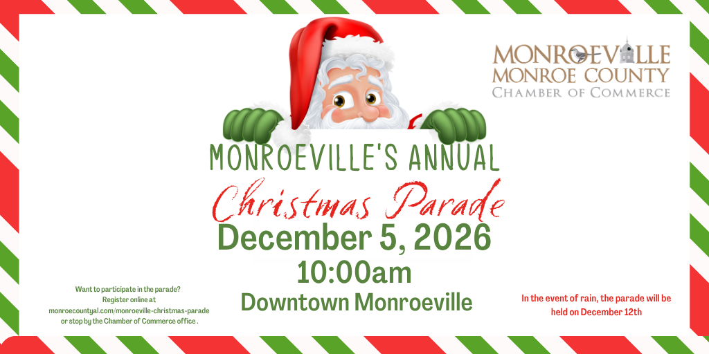 The Chamber will host Monroeville's Annual Christmas Parade on Saturday, December 5, 2026 at 10 am. The parade will take the traditional parade route through downtown Monroeville. In the event of rain, the parade will be held on Saturday, Dec. 12, 2026 at 10 am. For more information, contact the Chamber at 743-2879.