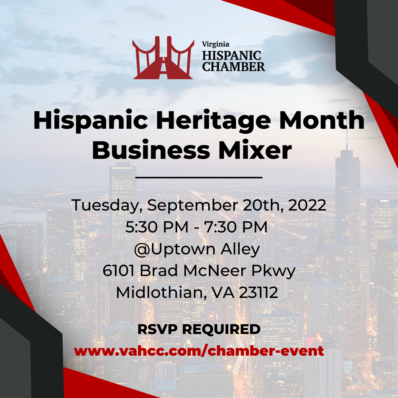 Join us at Uptown Alley for our Hispanic Heritage Month Business Mixer! Make new and lasting connections to grow your business. Enjoy exquisite appetizers and drinks. Share your salsa skills or learn how to salsa with The Salsa Guy. We can't wait to see you there!