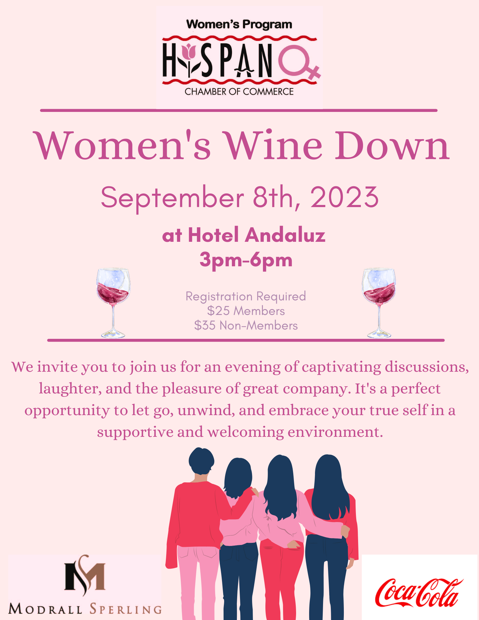 Ladies, mark your calendars and get ready to unwind with an unforgettable Women's Wine Down event on Friday, September 8th, from 3 PM - 6 PM at the beautiful Hotel Andaluz. We will enjoy delightful wines, mouthwatering charcuterie boards, great company, and lasting conversations. Let's raise our glass to the Women's Wine Down and register today. You won't want to miss this one!
