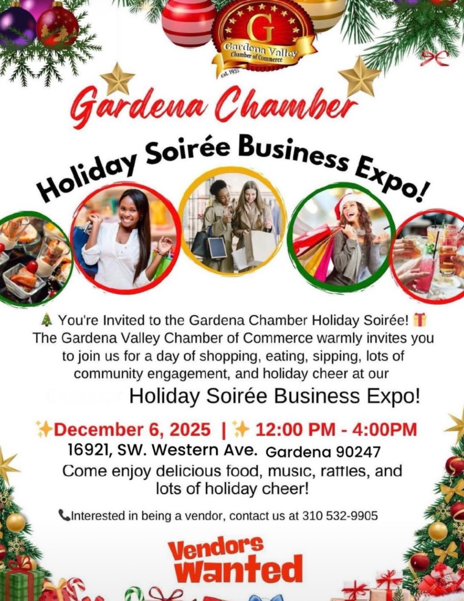 🎄❄️☃️ This event will be hosted indoors 🎁✨🕯️ Get into the festive spirit with the Gardena Valley Chamber of Commerce Holiday Soirée Business Fair—a cheerful afternoon of networking, celebration, and community connection! This special holiday event will feature local businesses showcasing their products and services, seasonal treats, music, raffles, and plenty of opportunities to shop small and support local. Join us for an afternoon of holiday cheer as we celebrate the season, build new business relationships, and highlight the vibrant entrepreneurial spirit of Gardena!