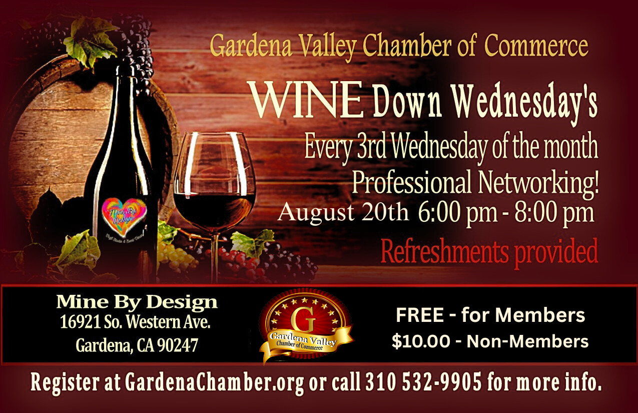 Join Gardena Chamber's Wine Down Wednesday vibrant monthly networking event that brings together local professionals, business owners, and community members for an evening of relaxed connection and collaboration. Held in a welcoming, casual atmosphere, attendees enjoy curated wine and light refreshments, and engaging conversations that foster new relationships and strengthen community ties. If you're looking to grow your network, showcase your business, or simply unwind with like-minded individuals, Wine Down Wednesday offers the perfect blend of business and pleasure in the heart of Gardena.