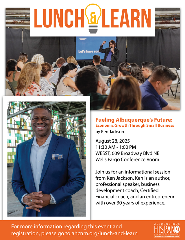 Join us on Thursday, August 28, 2025, from 11:30 AM to 1:00 PM at the Albuquerque Hispano Chamber of Commerce for our monthly Lunch and Learn—an engaging, informative session designed to help entrepreneurs, professionals, and small business owners thrive.